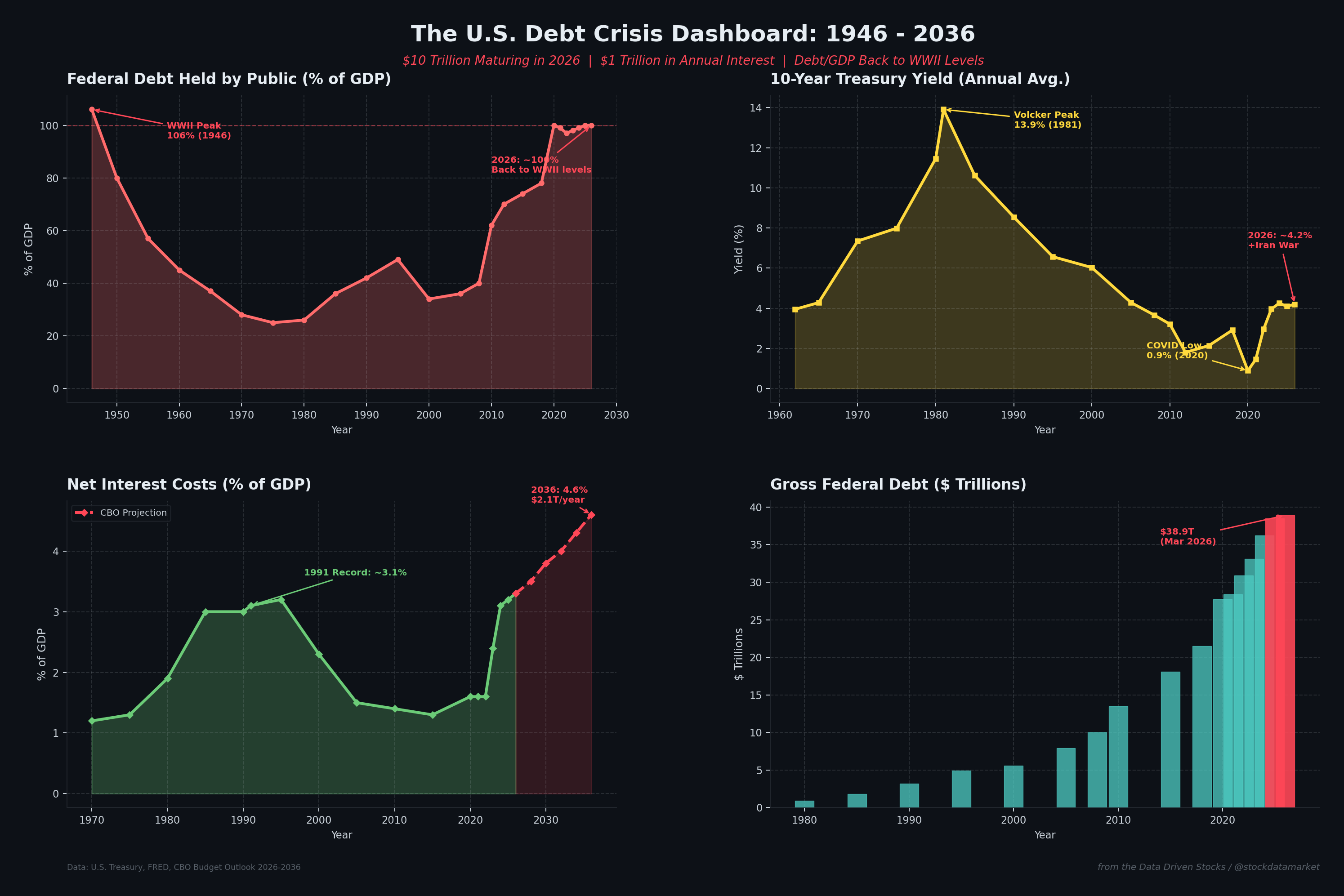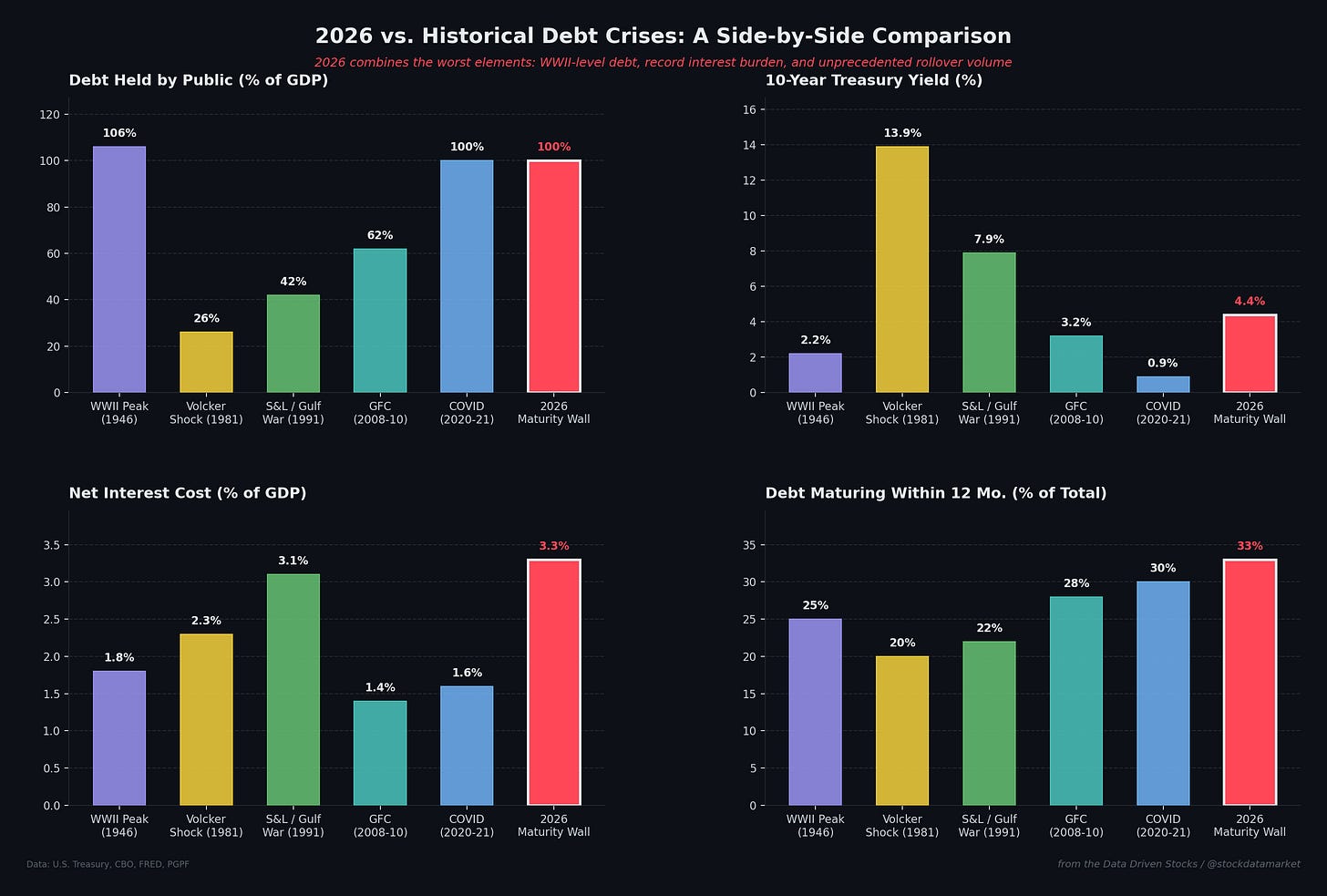 What makes 2026 uniquely dangerous is the simultaneous presence of all the worst elements from each of these episodes. You have WWII-level debt loads, interest costs that have eclipsed the 1991 record as a share of GDP, an unprecedented 33% of debt maturing within 12 months, rising yields driven by a war that shows no signs of ending, and a Federal Reserve that can’t cut rates because of oil-driven inflation. No single previous episode combined all these risk factors at once.