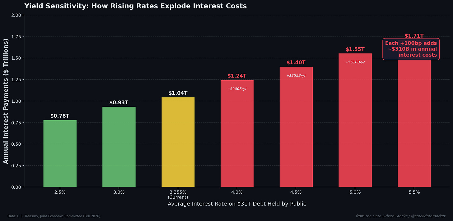 The math is brutal and simple. At roughly $31 trillion in debt held by the public and a 3.355% average rate, the federal government is paying about $1.04 trillion per year in net interest. Each additional percentage point (100 basis points) on that average rate translates to approximately $310 billion in additional annual interest payments. So if the average rate drifts up to, say, 4.35% - which is entirely plausible given where current market yields are - that’s an extra $310 billion per year in interest costs alone, without a single dollar being added to the national debt.