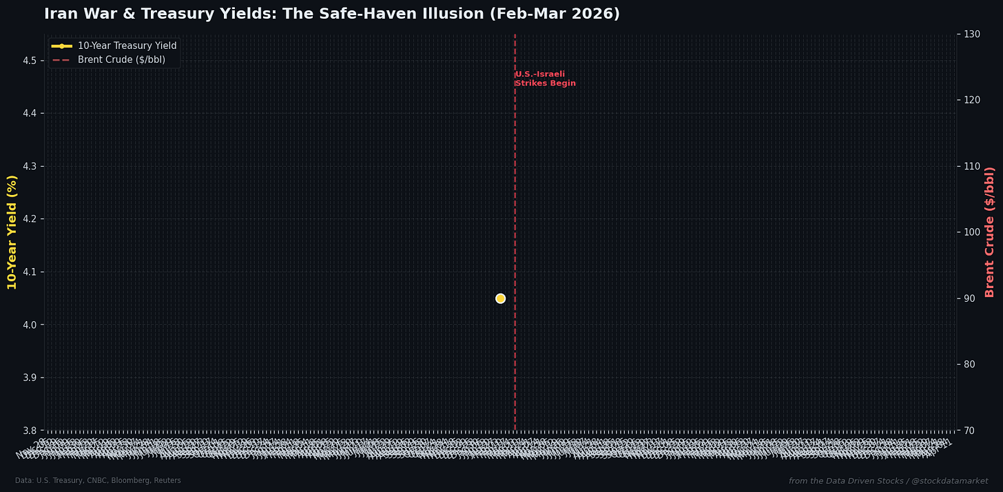 As if the structural debt problem wasn’t enough, the U.S.-Iran war that began on February 28, 2026 has thrown a massive wrench into the Treasury market. The conflict has produced a phenomenon that confused even seasoned bond traders: instead of falling (as they normally do during geopolitical crises when investors flee to the safety of government bonds), Treasury yields surged.