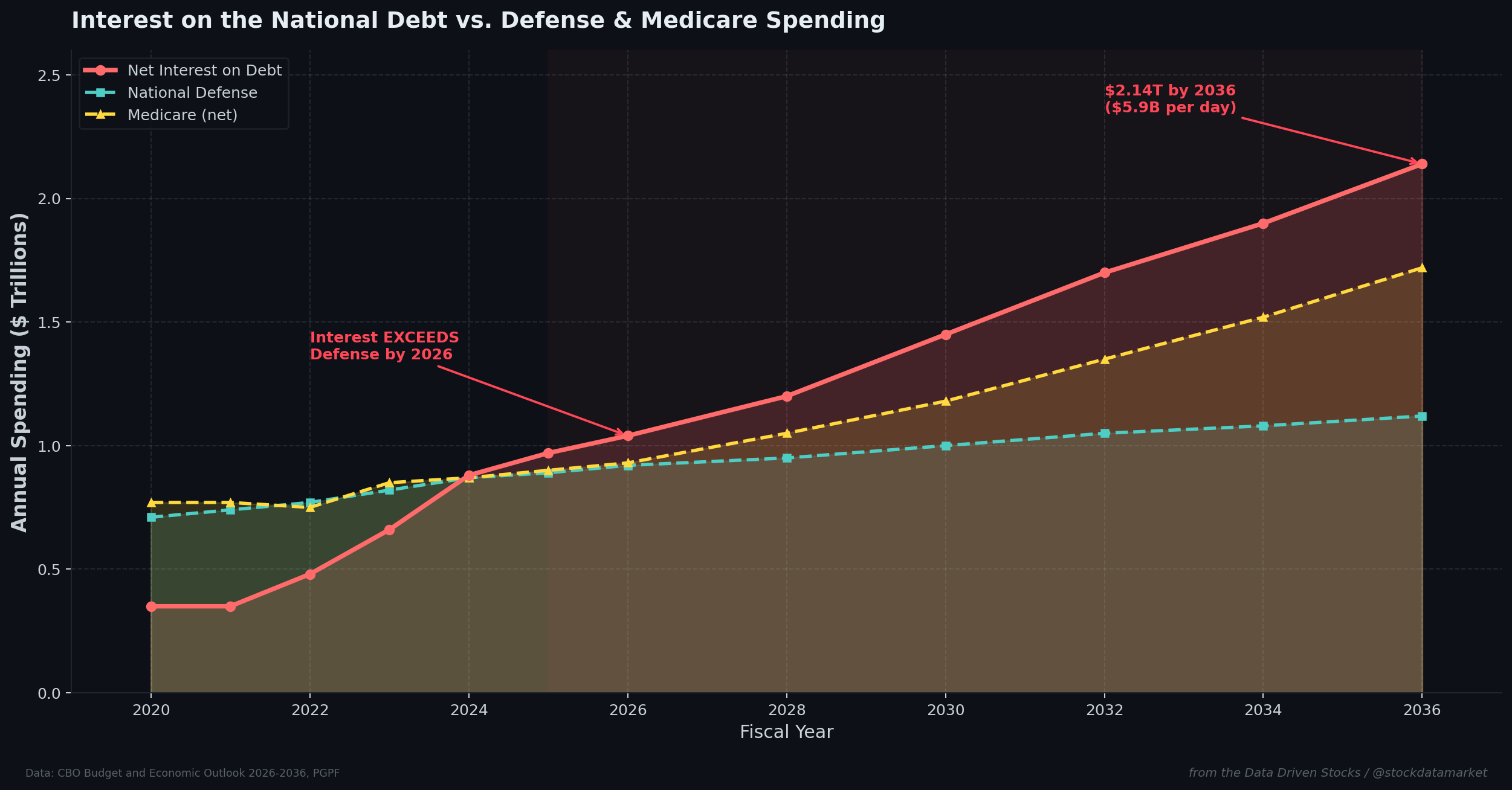 The Peterson Foundation captured the absurdity of the current trajectory in a single statistic: in 2026, the U.S. Treasury is paying $2.8 billion per day in interest. By 2036, that figure rises to $5.9 billion per day. Over the next decade, cumulative interest payments will total $16.2 trillion - roughly three times what the government spent on interest during the entire 2006-2025 period.
