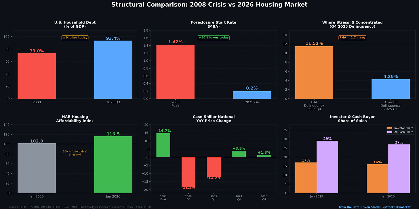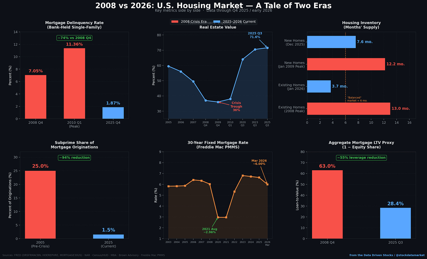 Metric 2008 Crisis Era 2025–2026 Verdict Bank mortgage delinquency (DRSFRMACBN) 7.05% (Q4 2008) → 11.36% peak 1.87% (Q4 2025) Far healthier Homeowner equity share ~37% (Q4 2008) 71.6% (Q3 2025) Massive buffer Aggregate mortgage LTV proxy ~63% ~28.4% 55% less leveraged Subprime share of originations ~25% (2005) <1.5% Eliminated Foreclosure start rate ~1.42% peak 0.20% (Q4 2025) 86% lower Existing-home months’ supply 13 months (peak) 3.7 months (Jan 2026) Tight, not oversupplied Case-Shiller National YoY −18.2% (Q4 2008) +1.3% (Dec 2025) Cooling, not crashing Household debt / GDP 73% (2008) 93.4% (Q3 2025) Higher — watch this 30Y mortgage rate ~6.0% (2008) ~6.0% (Mar 2026) Similar, but context differs Lending standards Collapsing (stated income, NINJA) Basically unchanged (SLOOS Q4 2025) Night and day