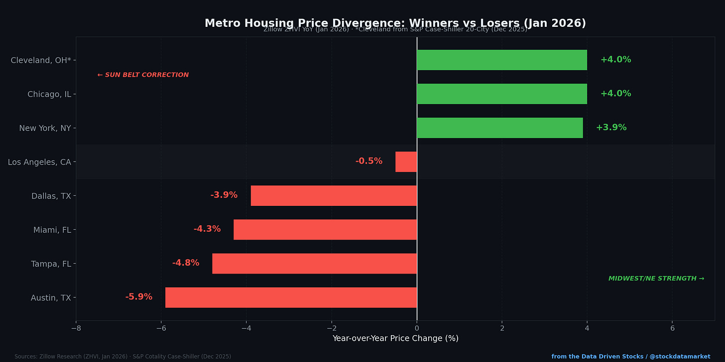 Meanwhile, Midwest and Northeast metros that were “boring” during the pandemic boom are outperforming. Chicago is up 4.0% YoY, New York 3.9%, and Cleveland 4.0% (per the Case-Shiller 20-City index). These markets had less speculative froth to unwind, tighter inventory to begin with, and better relative affordability.