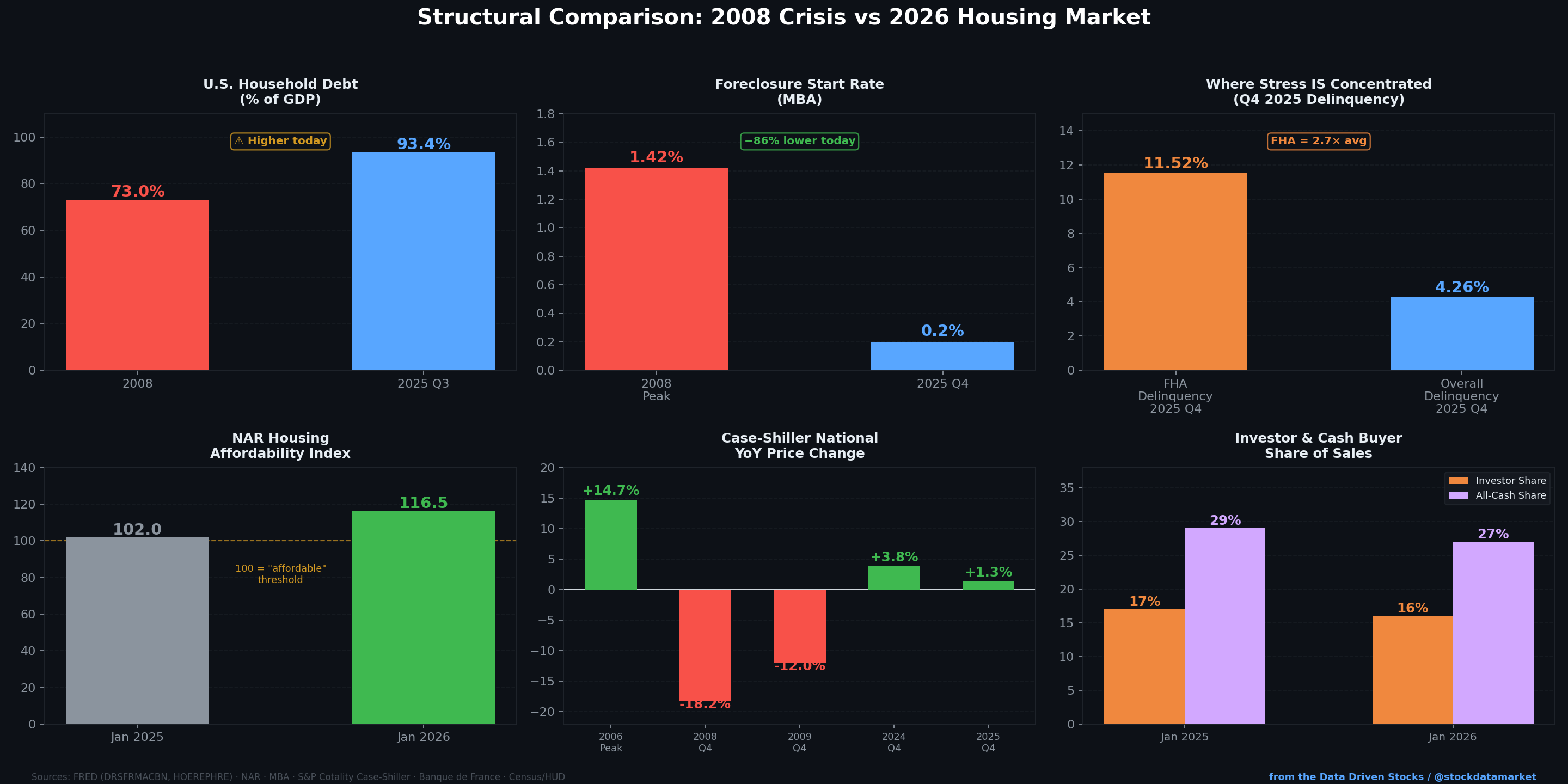 But feelings and data are two very different animals. So we pulled the actual numbers — the same FRED series, the same MBA reports, the same Case-Shiller data that economists use — and stacked 2026 against 2008 across every metric that matters. The result? This is not your father’s housing crisis. Not even close. But that doesn’t mean there’s nothing to worry about.