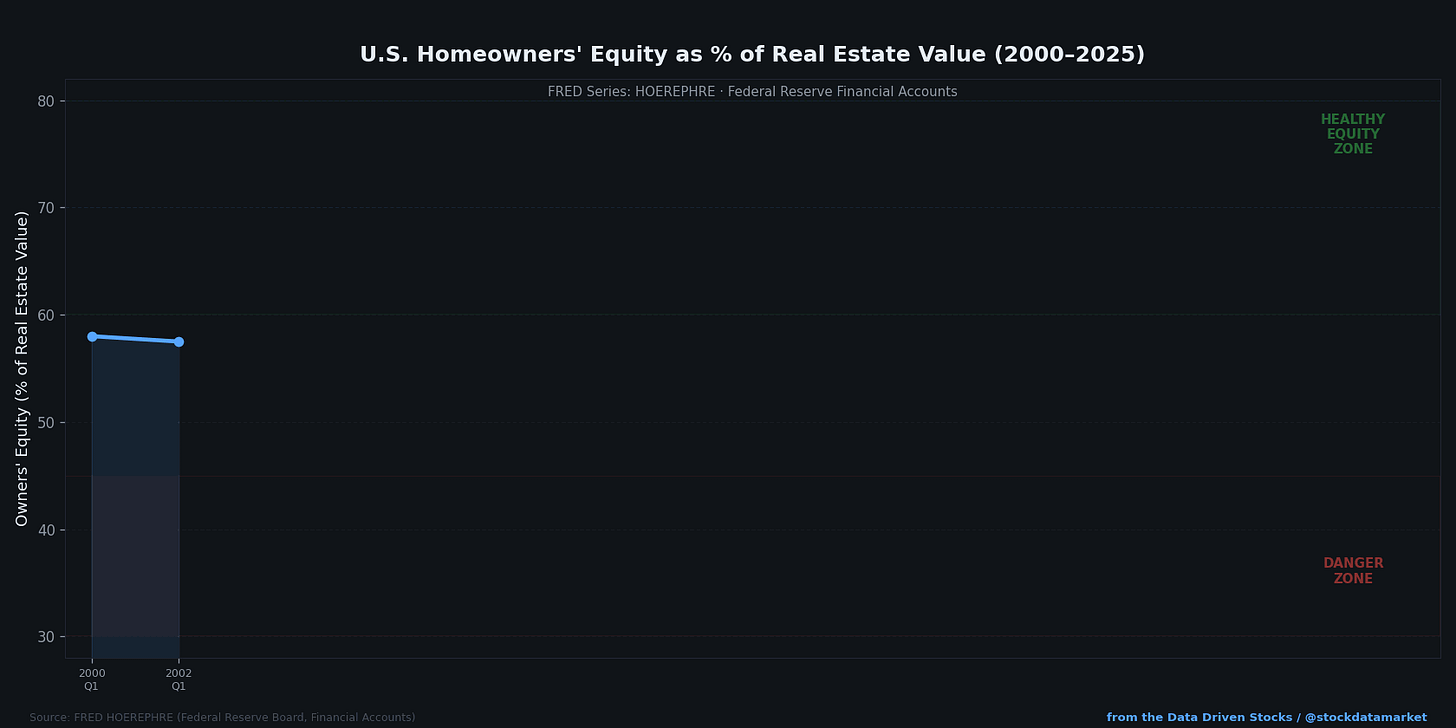 The Fed tracks a series called HOEREPHRE — homeowners’ equity as a percentage of household real estate value. In Q4 2008, when the crisis was raging, that number had cratered to roughly 37%. That meant the average American homeowner had only 37 cents of equity for every dollar of home value. Negative equity was rampant. Millions of people owed more than their homes were worth, which is exactly the condition that turns a price decline into a foreclosure cascade.