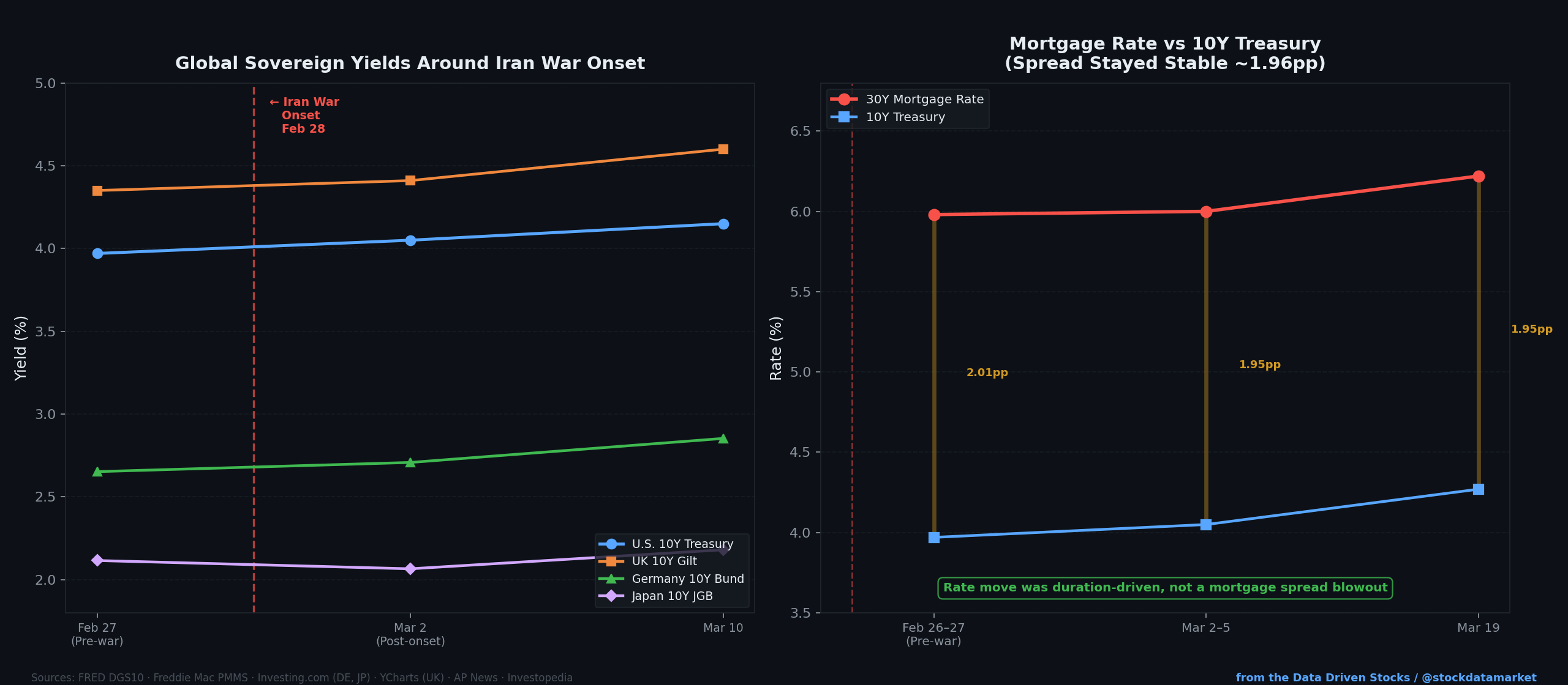 The U.S. 10-year Treasury yield moved from 3.97% on February 27 (the day before the strikes) to 4.26% by March 19. The 30-year fixed mortgage rate followed, climbing from about 5.98% pre-onset to 6.22% by mid-March. That’s a meaningful move for anyone trying to buy a home or refinance — and it came just when rates had been gradually improving.