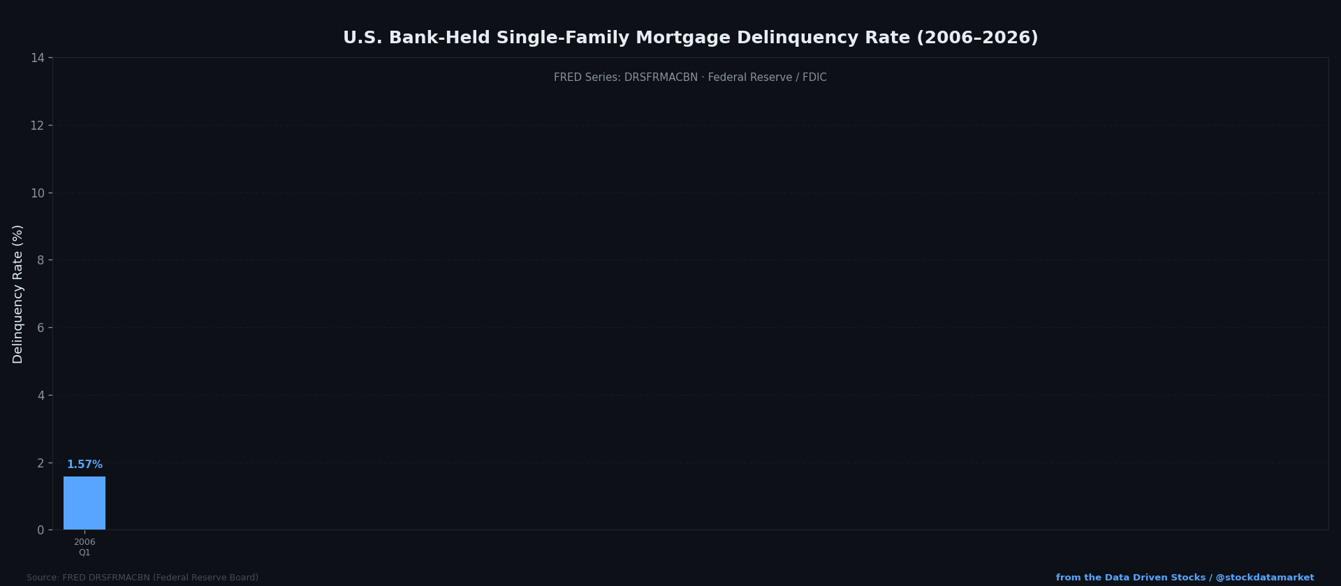 Start with the number that matters most when people ask “is it 2008 again?” — mortgage delinquency rates. The Federal Reserve tracks a series called DRSFRMACBN, which measures the delinquency rate on single-family residential mortgages held by commercial banks. It’s been running since the 1990s, it’s publicly available on FRED, and it’s the cleanest apples-to-apples comparison we’ve got.
