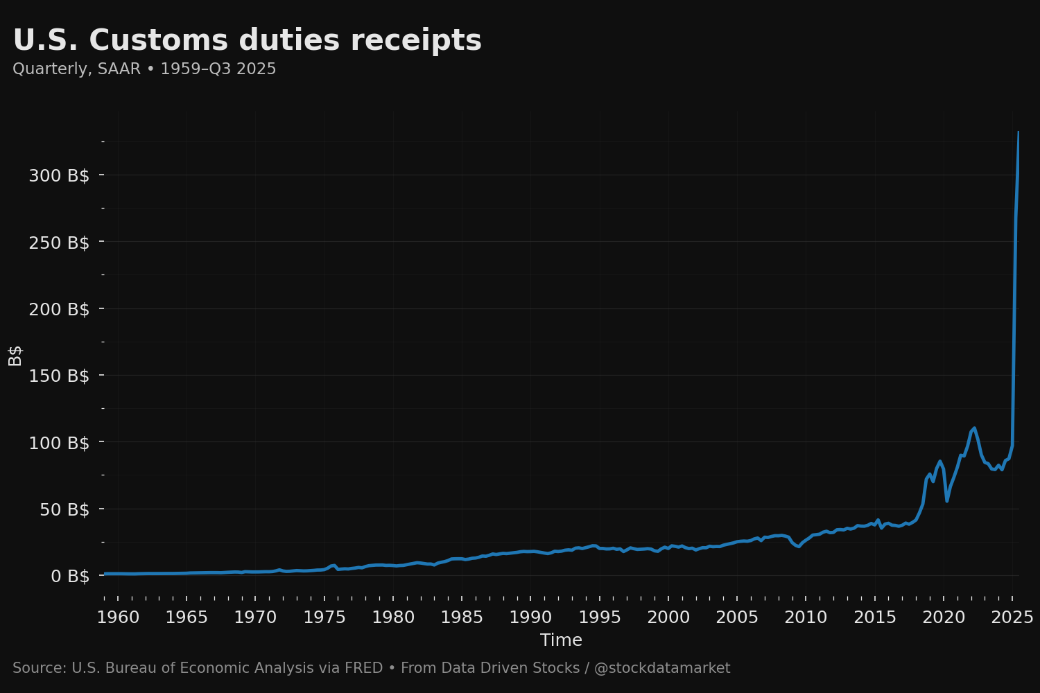 Reuters reported net customs duties hit a record $195 billion in fiscal 2025, with monthly receipts in the “low $30 billion” range afterward.