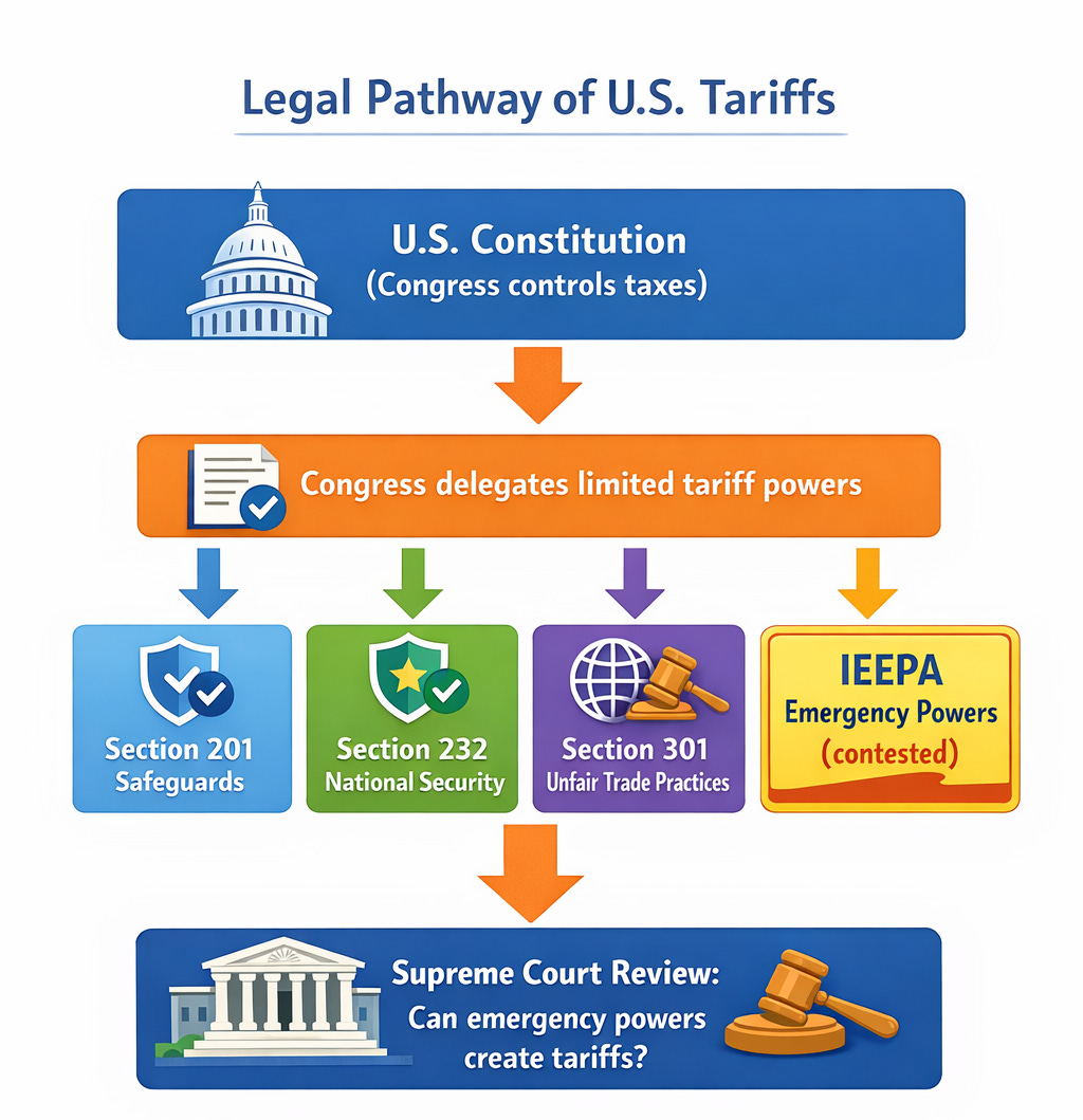 Legally, it’s way messier, because tariffs are basically a tax. In the U.S. system, Congress is supposed to control taxing and trade rules, and then it delegates certain powers to the president through specific statutes. That’s why you keep seeing different “tariff flavors”: Section 201, 232, 301… each has its own rules, process, and limits.