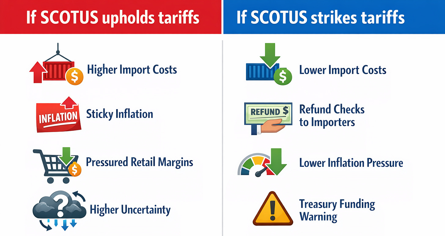 If the Court nukes the tariffs, it’s not just a trade-policy headline. It’s potentially a refunds-and-revenue story (think: $100B+), an inflation story, and a “how much executive power is too much?” story.