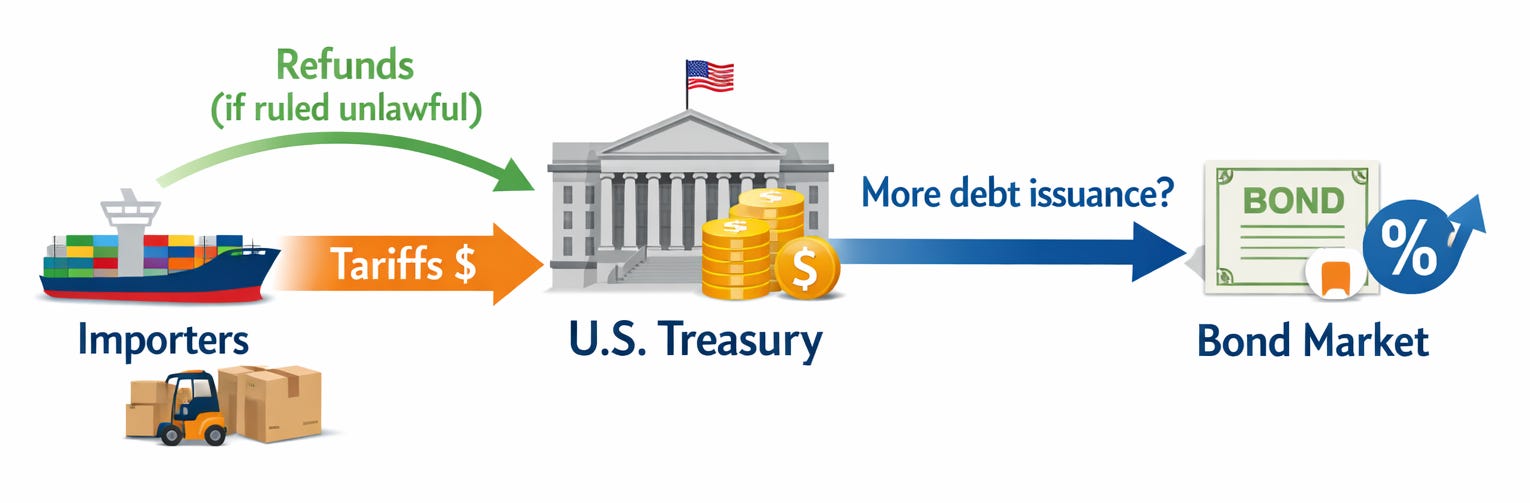 But if the government loses tariff revenue and/or pays refunds, it might have to finance that gap. More borrowing can mean more Treasury issuance, which can put upward pressure on yields—exactly the “fiscal fallout” angle Reuters quoted investors discussing.