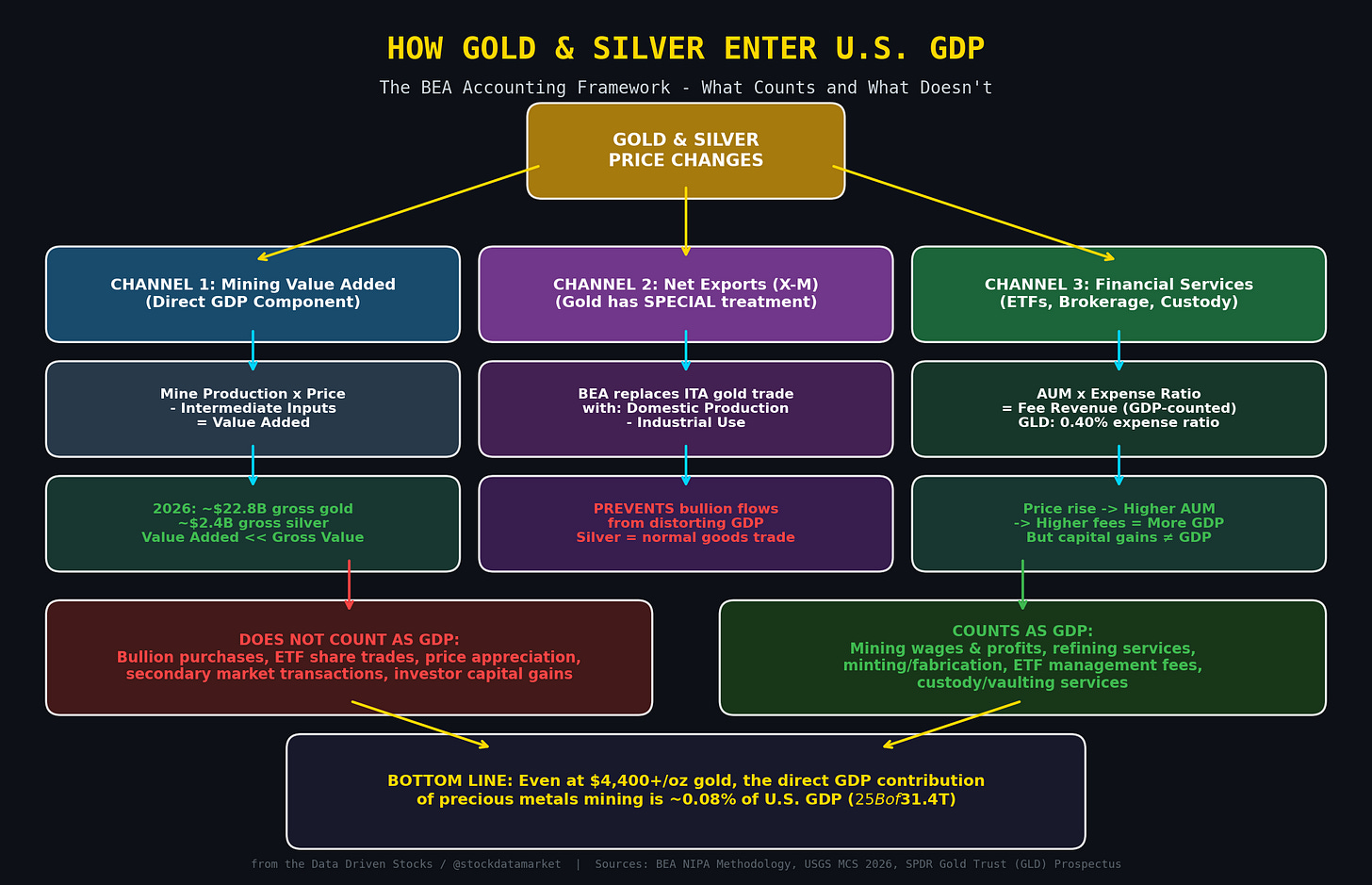 The entire U.S. precious metals mining sector generates roughly $25 billion in gross production value, maybe $10-15 billion in GDP-counted value added, out of a $31.4 trillion economy. That is less than 0.08% of GDP. The BEA’s special accounting treatment for nonmonetary gold prevents bullion flows from distorting the numbers further. And the appreciation in the value of gold holdings - the thing that actually excites investors - does not count as GDP at all.