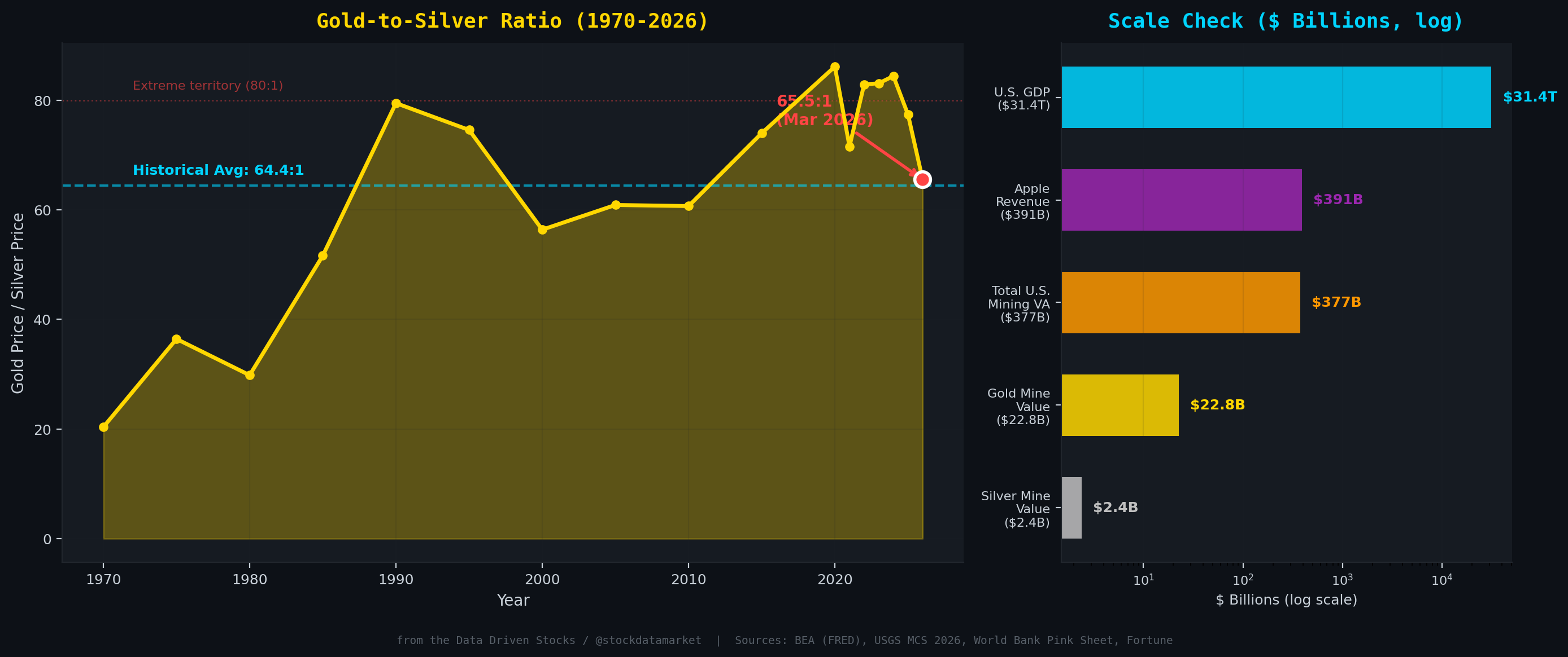 The gold-to-silver ratio sits at roughly 65:1 in late March 2026, meaning it takes 65 ounces of silver to buy one ounce of gold. This is near the historical average of about 64:1 dating back to 1970, but it represents a significant compression from the extreme levels above 85:1 seen during COVID in 2020.