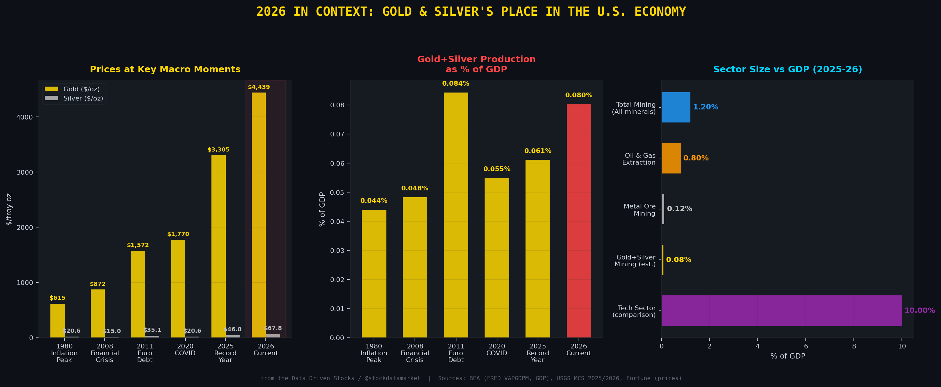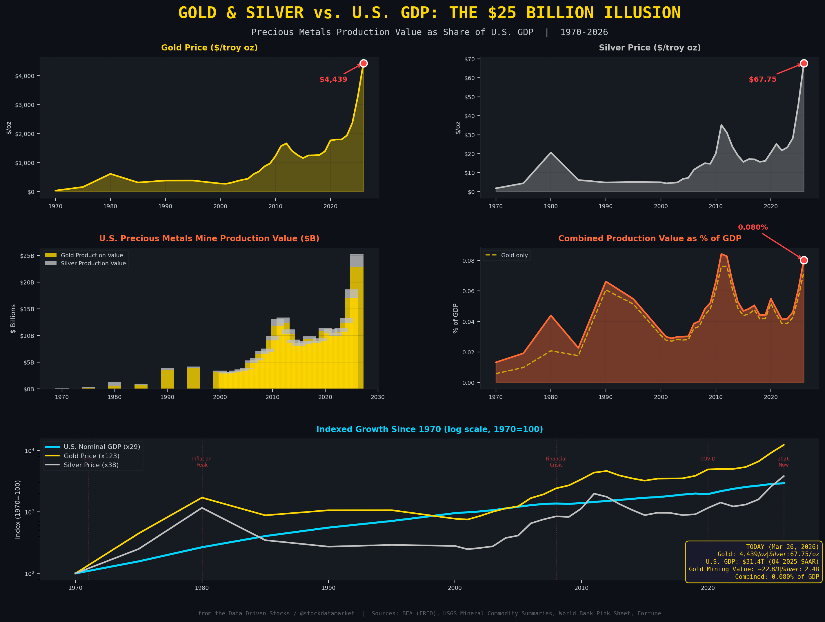 Gold just cracked $4,400 an ounce. Silver is trading at $67.75. If you scroll through financial Twitter right now, you will find no shortage of people screaming about the precious metals rally and what it means for the U.S. economy. But here is the thing nobody wants to hear: even at these absolutely historic price levels, the combined value of all gold and silver mined in the United States contributes roughly 0.08% to GDP. That is eight hundredths of one percent. Not eight percent. Not even one percent. Zero point zero eight.
