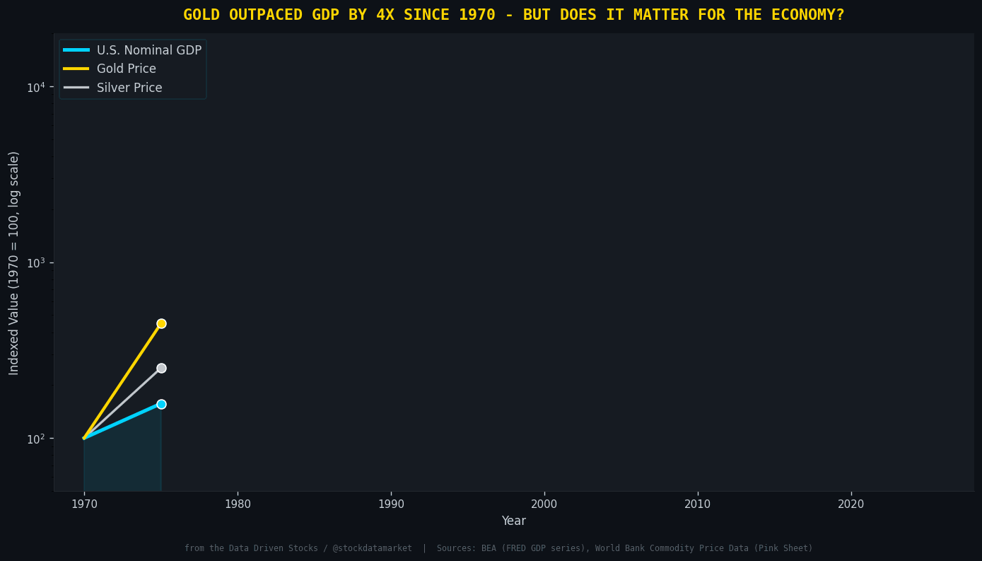 One of the most visually striking things about the gold story since 1970 is the sheer divergence in growth rates. Since Nixon closed the gold window in August 1971, ending the Bretton Woods era of dollar-gold convertibility at $35 per ounce, the price of gold has multiplied roughly 123 times. Silver has grown about 38x over the same period. U.S. nominal GDP, meanwhile, expanded about 29x, from $1.07 trillion to $31.4 trillion.