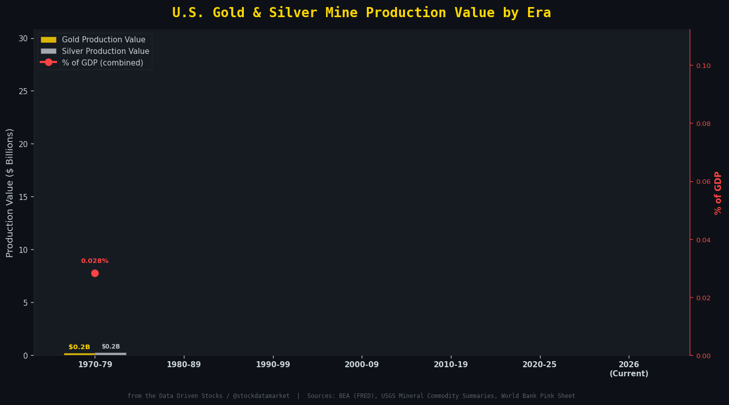 The result is that the gross dollar value of U.S. gold production has increased enormously, from about $3.5 billion in 1990 to $22.8 billion in 2026, but as a share of the much-larger economy, the needle has barely moved. In the early 1990s, gold and silver mining contributed roughly 0.05% of GDP. Today, at record prices, it is about 0.08%. That is a 60% increase in share, sure, but 60% of almost nothing is still almost nothing.