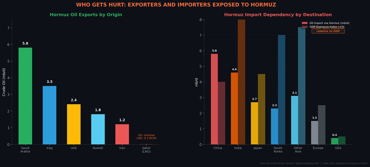 The distributional impact of a Hormuz disruption is profoundly uneven. Asia bears the overwhelming brunt. China imports approximately 5.8 mb/d of crude through the strait, India around 4.6 mb/d, Japan 2.7 mb/d, and South Korea 2.3 mb/d. For India in particular, oil imports represent a much larger share of GDP than for wealthier nations, making the economic shock proportionally more severe. India is arguably the most vulnerable major economy on the planet to a Hormuz closure.