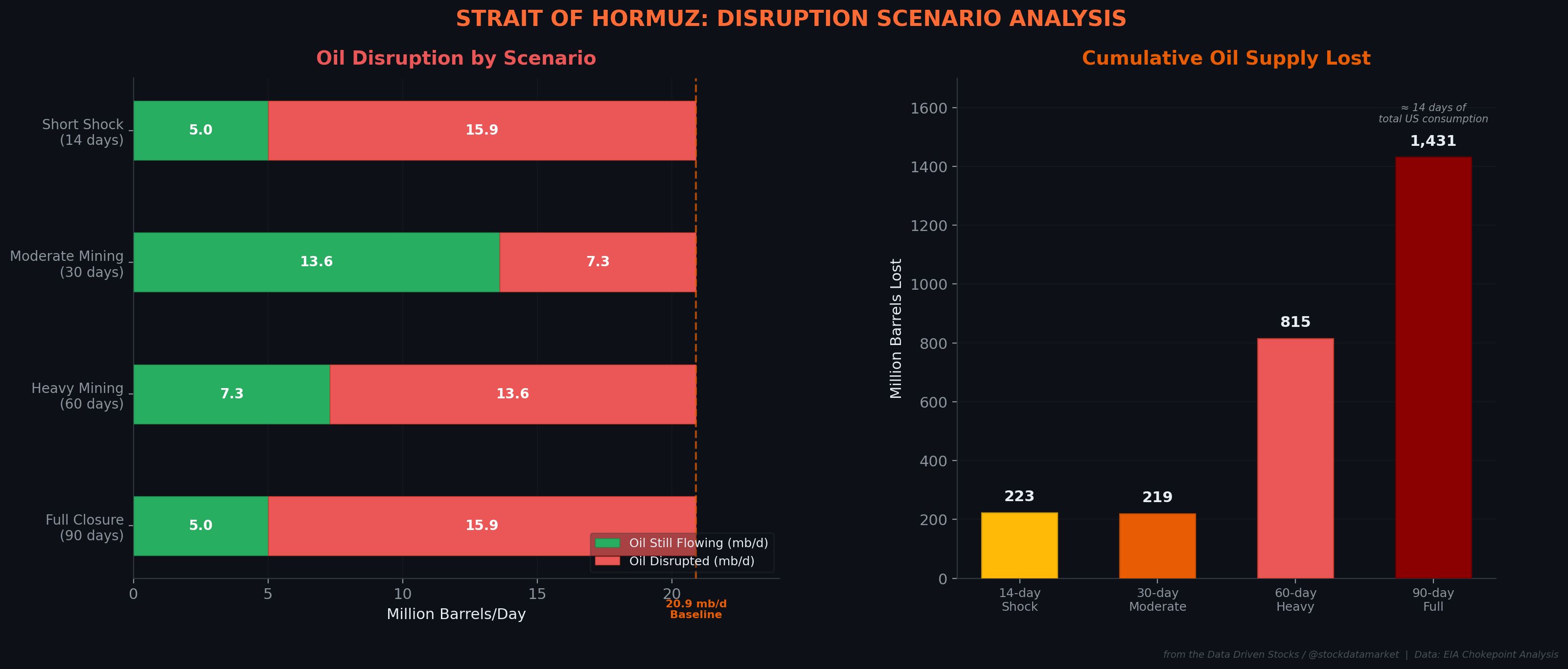 The EIA estimates that Saudi Arabia’s East-West Pipeline plus the UAE’s Abu Dhabi crude export pipeline could together provide approximately 4.7 mb/d of bypass capacity. Iran’s Goreh–Jask pipeline adds a further 0.3 mb/d. That totals roughly 5.0 mb/d. Against a baseline flow of 20.9 mb/d, this means approximately 15.9 mb/d — about three-quarters of total Hormuz oil transit — would be effectively stranded under a full closure, before any demand destruction, strategic reserve releases, or other emergency measures come into play.