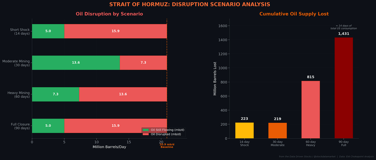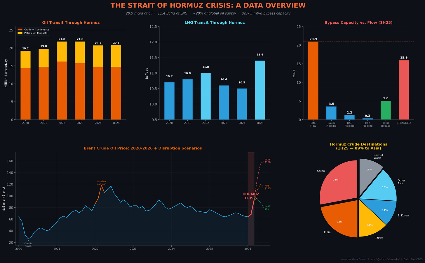 If you hold energy exposure, you are watching the single most consequential supply event since the 1970s unfold. If you do not hold energy exposure, you are about to feel it anyway — at the gas pump, in shipping costs, in inflation prints, and in the GDP data of every import-dependent economy on the planet. The data says this clearly. The market, I suspect, has not yet fully priced it in.