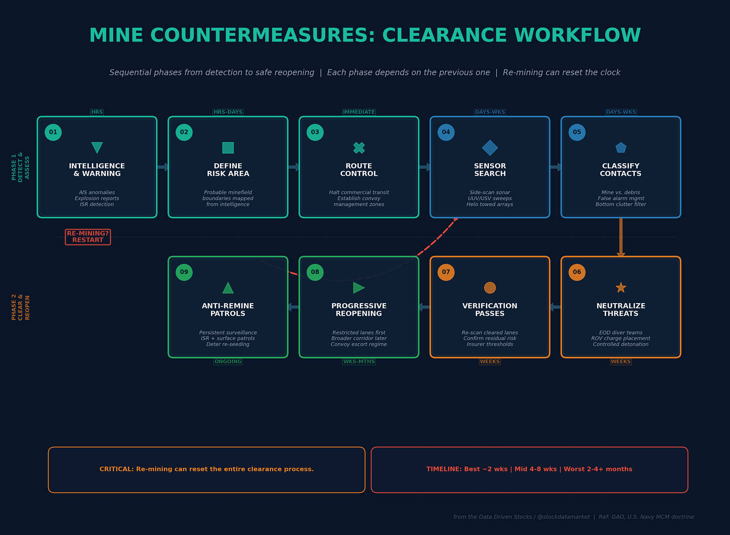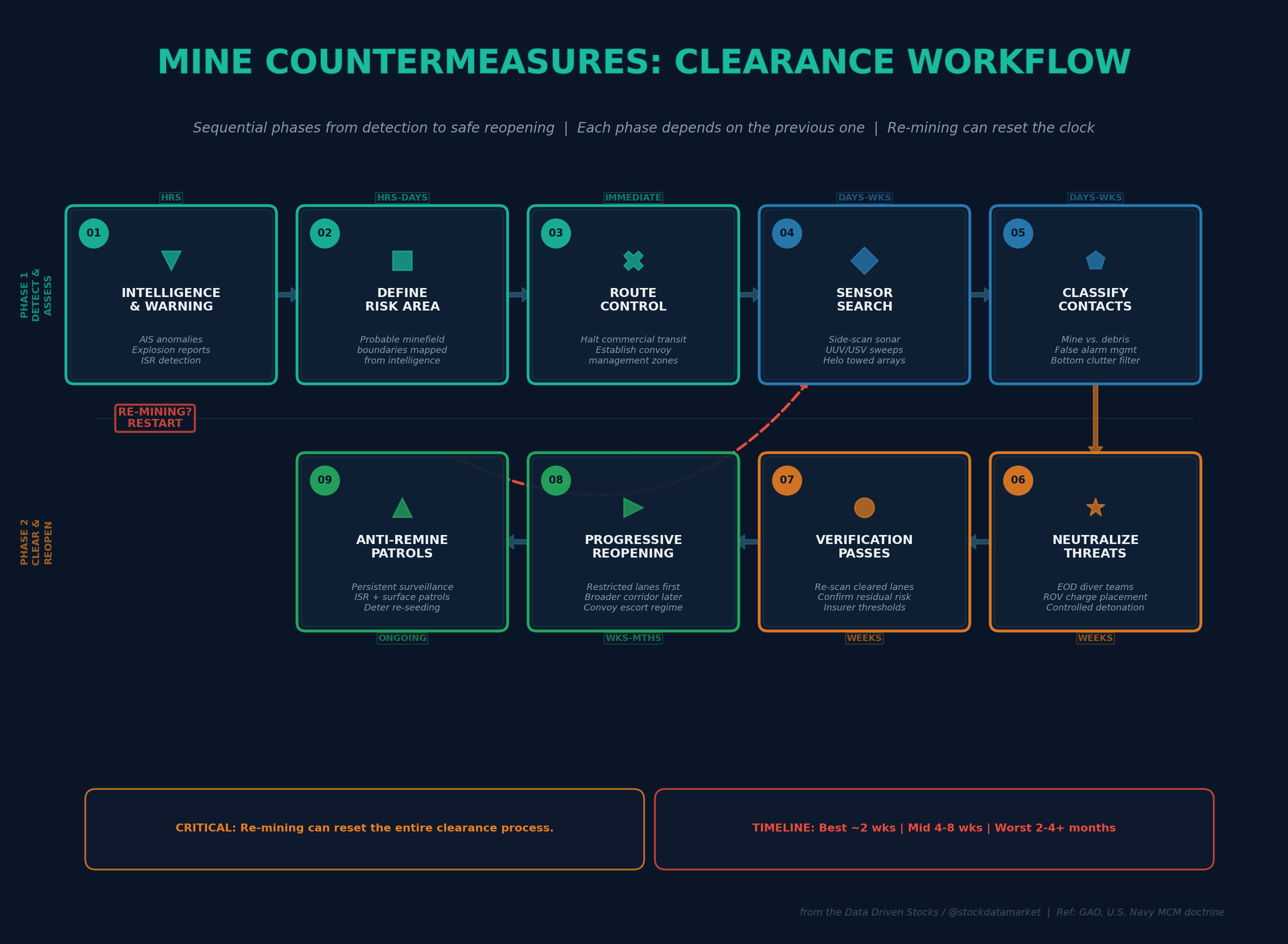 The third challenge is re-mining. Clearance is a one-time engineering task only if the adversary stops laying mines. If Iran can re-seed mines faster than coalition forces can clear them — which is entirely feasible given the asymmetry between laying (fast, cheap, dispersed) and clearing (slow, expensive, concentrated) — then the problem shifts from a fixed obstacle to a running contest. This is the nightmare scenario that pushes timelines from weeks into months.