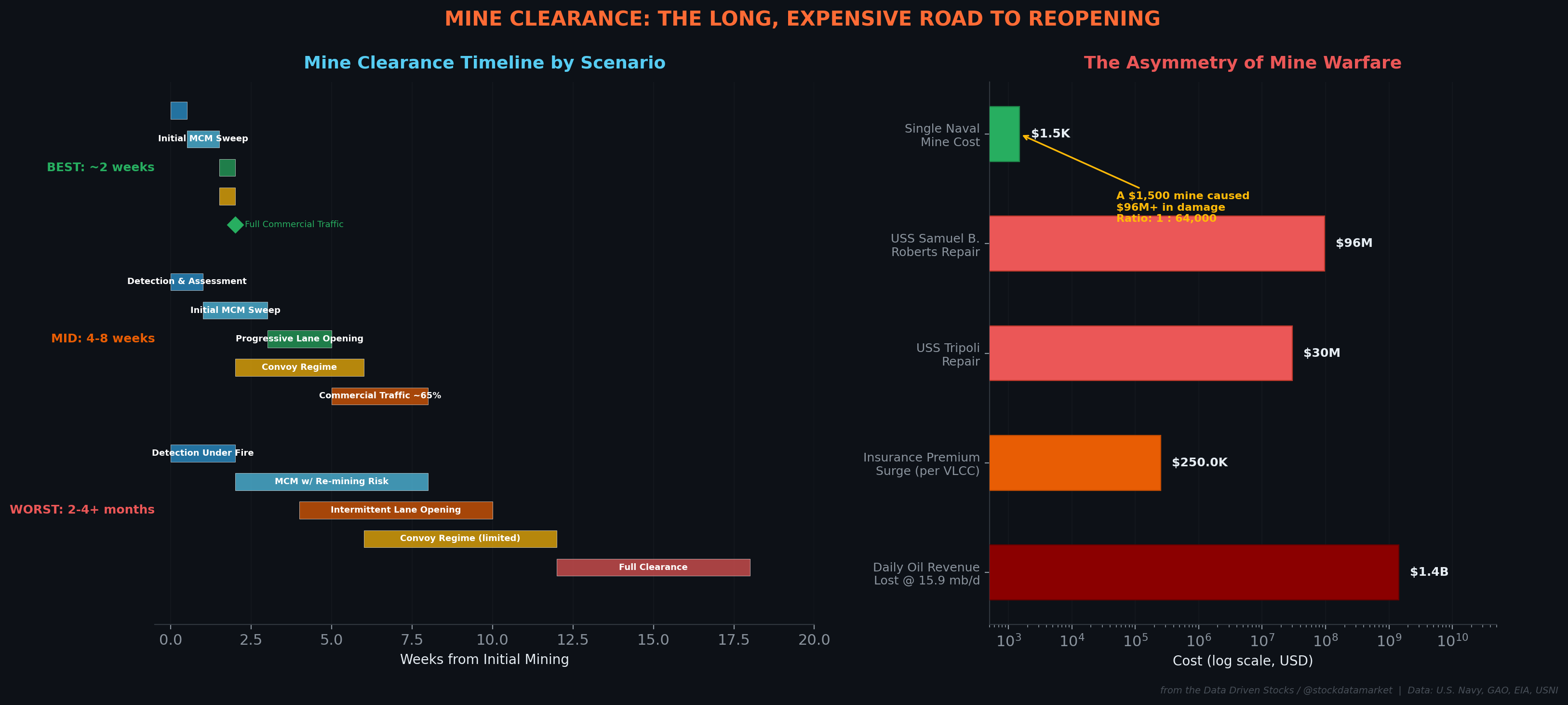 Under the best-case scenario — limited mining focused on intimidation, with a rapid international mine countermeasure surge and minimal re-mining pressure — a commercially acceptable corridor could be reopened in roughly two weeks, with throughput restored to about 65 percent of baseline. The mid-case scenario — a moderate barrier minefield in the traffic separation scheme lanes, with sustained MCM operations and a convoy regime — extends the timeline to four to eight weeks, with throughput around 35 percent during that period. The worst case — extensive layered mining with significant influence and bottom mine types, conducted under ongoing military threat with active re-mining — could push full clearance out to two to four months or longer. In this scenario, oil throughput would be limited to pipeline bypass capacity alone — about 5 mb/d out of a 20.9 mb/d baseline.