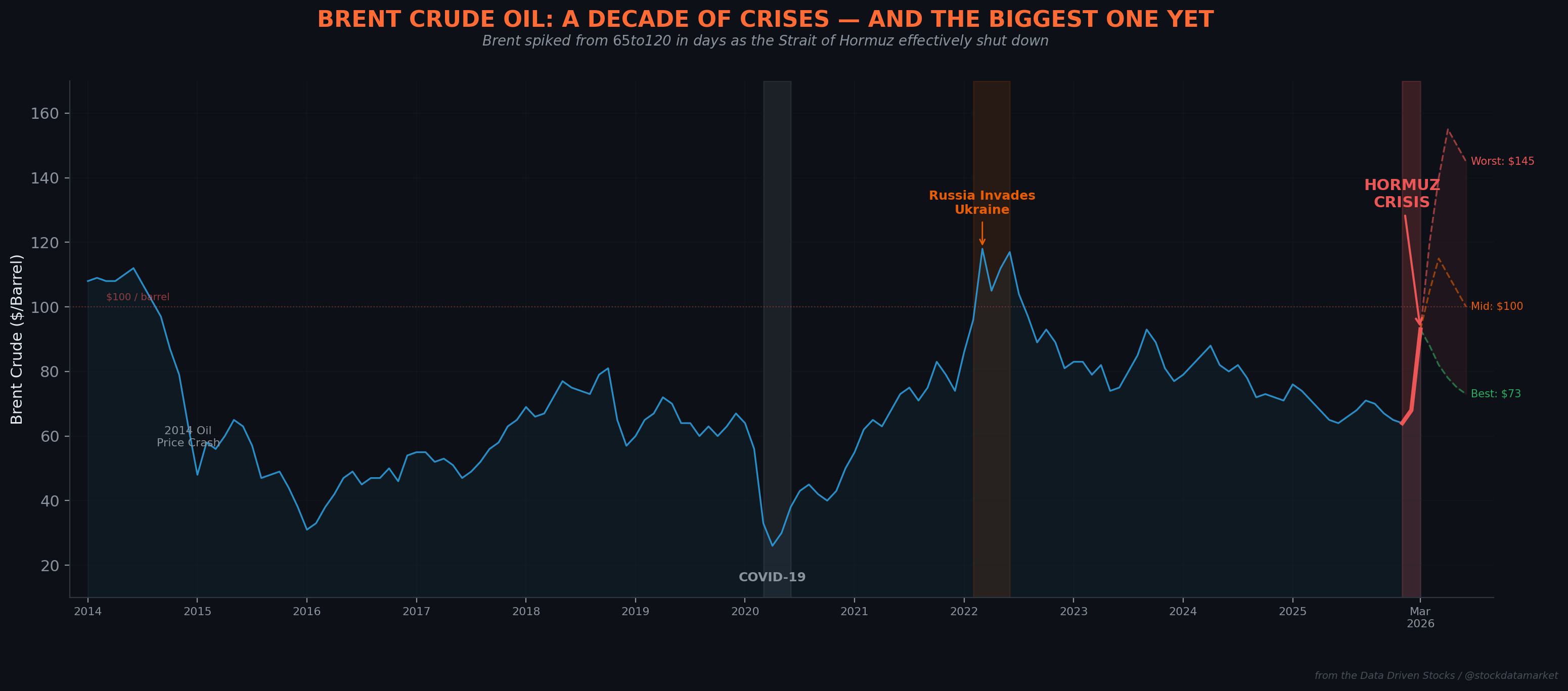 To put the current price action in context, consider what has happened to oil over the past decade. The 2014 price crash took Brent from $110 to $30 over the course of 18 months as Saudi Arabia flooded the market and U.S. shale production surged. COVID-19 crashed prices to $26 in April 2020. The Russian invasion of Ukraine in February 2022 sent Brent to $128 on supply fears. Each of these was a major event that reshaped energy markets for months or years.