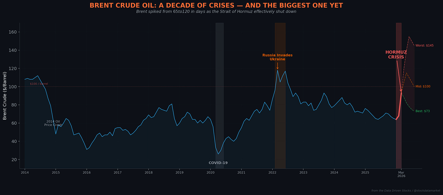 Brent crude was trading around $65 per barrel in late February 2026 before the U.S.-Israeli strikes on Iran began on February 28. Within days, it spiked above $90 and briefly touched $120. As of today, with confirmed mining activity and the effective closure still in force, Brent sits around $90 with extreme intraday volatility. Rystad Energy has projected that if conditions persist for four months, Brent could reach $135 per barrel. History says this is not hyperbole.
