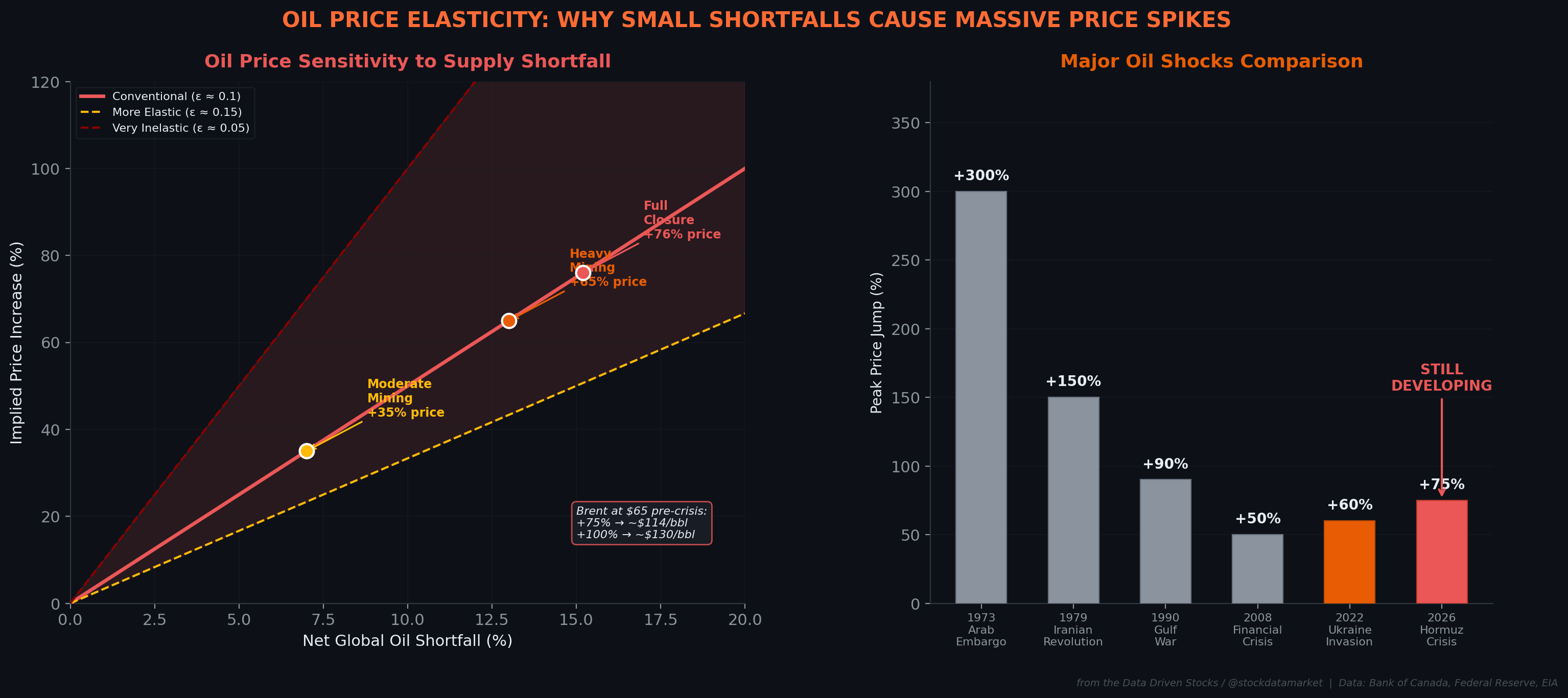This is where the economics become genuinely frightening. Oil markets are not like, say, the market for smartphones. In the short run, both supply and demand for oil are widely estimated to be highly price-inelastic. A Bank of Canada working paper on oil price elasticities targets short-run elasticities of approximately 0.10 for supply and negative 0.10 for demand — consistent with what it describes as “conventional” views. The Federal Reserve Board has published similar estimates.