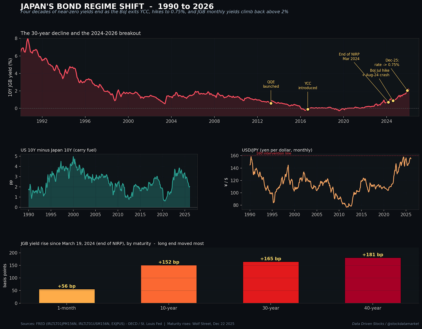 For thirty years, the most important number in global finance was a zero. It was printed on the front end of the Japanese yield curve, stamped onto the back of every carry trade in every emerging market, and quietly embedded into the valuation of every growth stock that required cheap money to make the math work. That zero is gone. On December 19, 2025, the Bank of Japan raised its policy rate to 0.75%, the highest level since 1995, and told markets more hikes are coming. The Japanese 10-year yield, which spent most of the last decade trading near or below zero, climbed to 2.11% on the FRED monthly series in February 2026 - its highest monthly reading in nearly 27 years - and Japan Bond Trading Co. daily benchmarks showed the 10Y at 2.38% on April 3, 2026. The world’s second-largest sovereign bond market is being repriced in real time, and most investors outside of Tokyo have not yet worked out what that means for the assets they own.