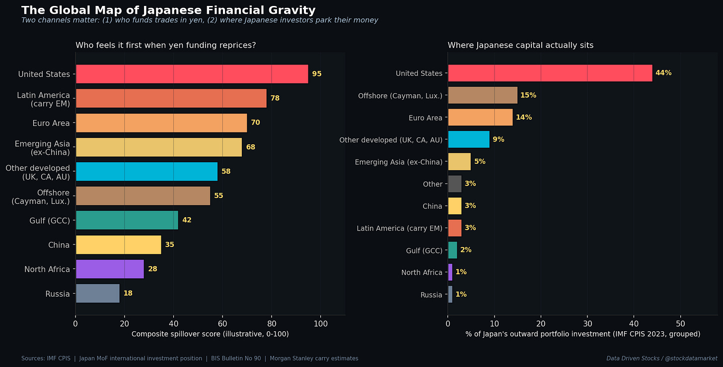 Japan matters to every region of the world, but not in the same way. Two distinct channels operate at once, and they affect different places differently. The first channel is the carry trade: who borrows yen to fund leveraged positions. The second is real-money Japanese capital: where Tokyo’s banks, insurers, pension funds and the Government Pension Investment Fund actually park their reserves.