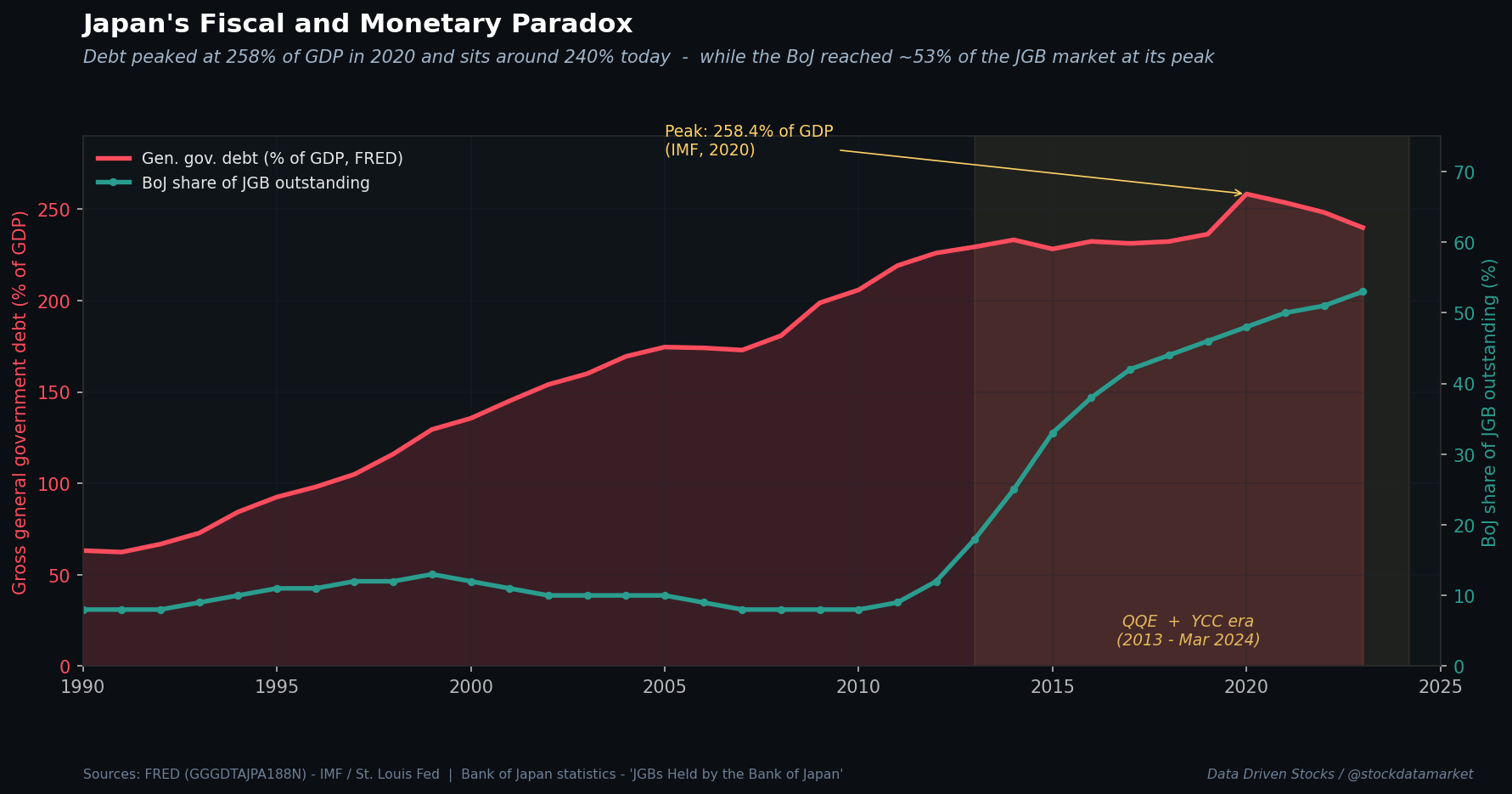 The paradox at the center of all this is simple and terrifying. Japan runs the largest government debt load in the developed world - a gross general government debt ratio that peaked at 258% of GDP in 2020 and still sits around 240% today, per the IMF data on FRED - and simultaneously has one of the lowest interest bills as a share of GDP in the G7. That arithmetic only works because the BoJ has been holding yields down and absorbing supply. Take the BoJ’s bid out of the market and the arithmetic changes fast. This is exactly what is now happening.