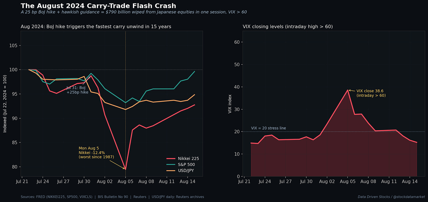 In the first week of August 2024, the global financial system had a seizure. It did not start with US macro data. It did not start with a bank failure. It started with a 25 basis point rate hike in Tokyo and a hawkish press conference.