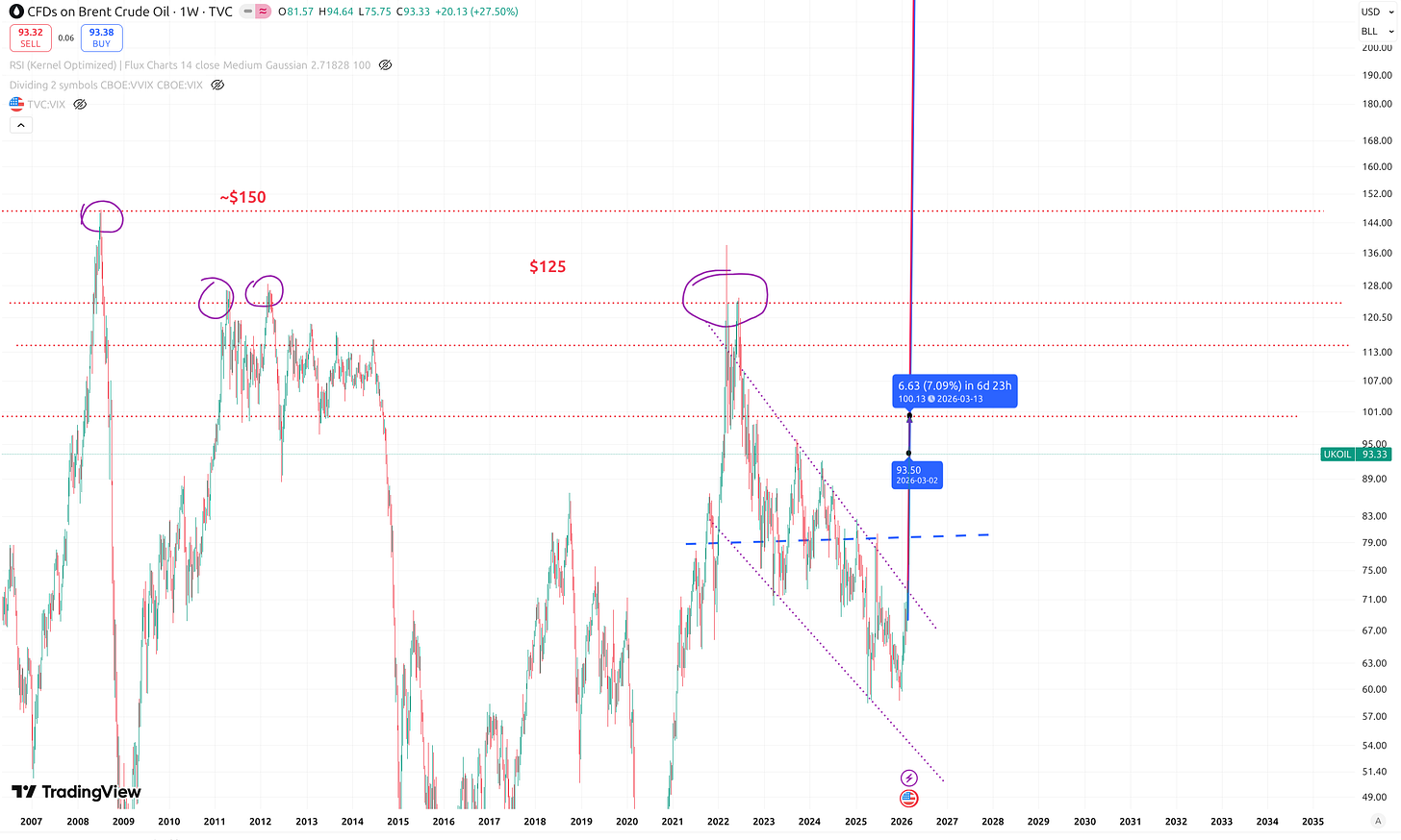 The next major resistance zone sits at $100, which has obvious psychological significance and aligns with the blue projection line on the chart. Above that, the $120–$128 zone (the 2022 highs) represents a major ceiling. The $150 area (2008 peak) is the kind of extreme scenario that only materializes if the Strait remains closed for months.