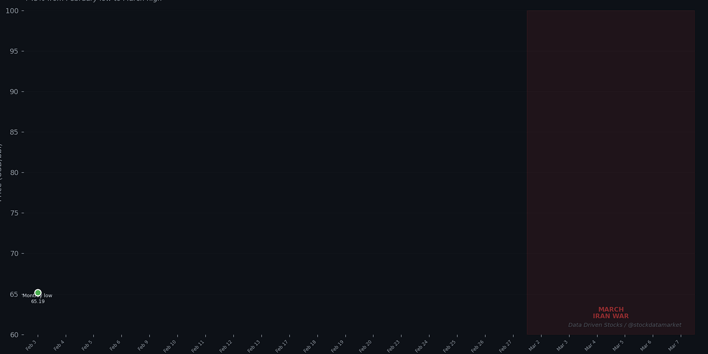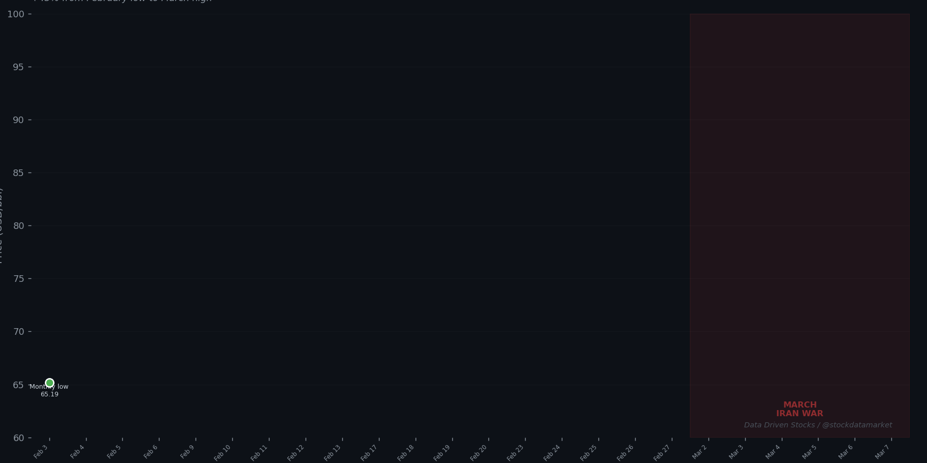 February then became a volatile consolidation. The month played out in two distinct phases. During the first half (February 2–17), Brent traded in a tight $65–$70 band as U.S.-Iran nuclear negotiations produced mixed signals. The monthly low of $65.19 was printed on February 3rd. The second half (February 18–27) saw a decisive shift into a $70–$72 range as war risk premiums built. By February 26th, Brent hit $72.36 intraday and closed above $71 for three consecutive sessions. Arbat Capital estimated at the time that markets were already embedding roughly $10/bbl of war risk premium.