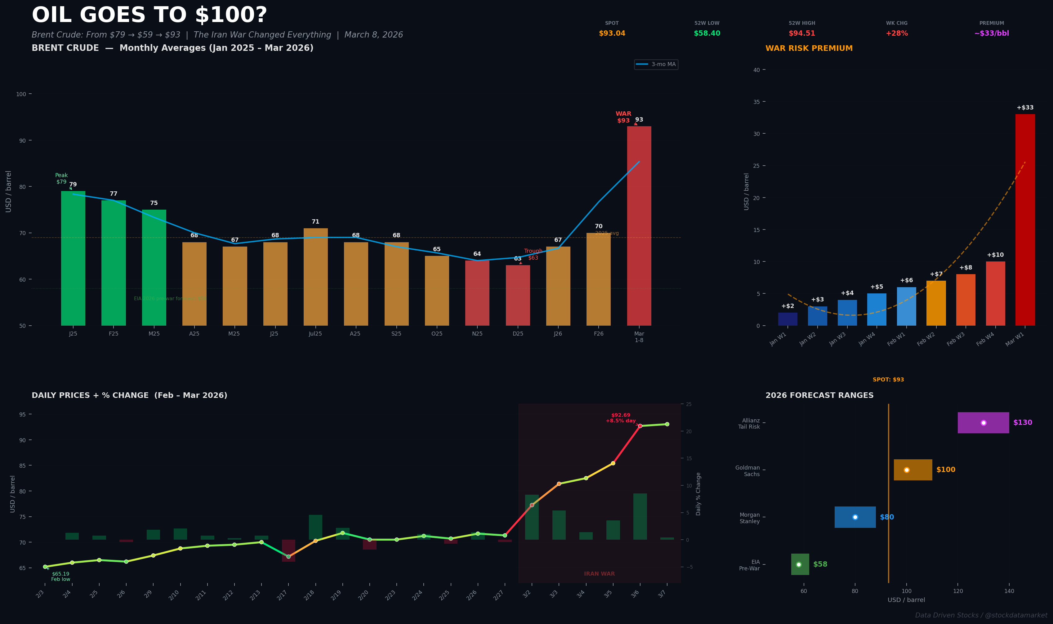 Friday March 6th was the day the market went truly parabolic. Brent surged 8.5% in a single session — up $7.28 — to close at $92.69 and briefly touch $90 for the first time in roughly two years. Goldman Sachs issued an urgent client note warning that $100 oil could arrive the following week if no resolution emerged. Over the weekend, as Iran targeted U.S. facilities in the UAE, Brent futures hit an intraday high of $94.51.