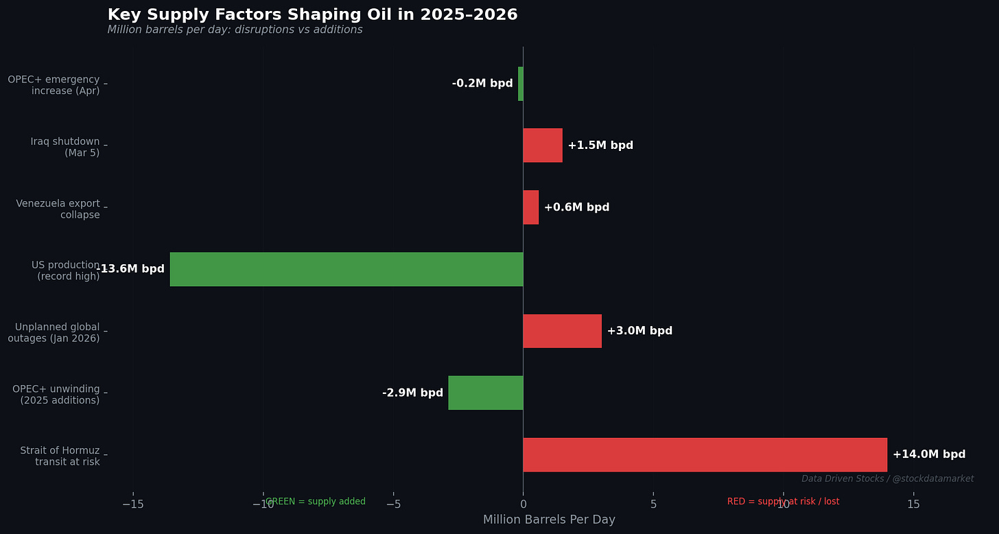 On the bearish side, the OPEC+ production unwinding added 2.88 million bpd over the course of 2025, and U.S. production at a record 13.6 million bpd provides a substantial baseline. But that supply was already priced into the $60-something range. The war is additive disruption on top of a market that had only just started finding a floor.