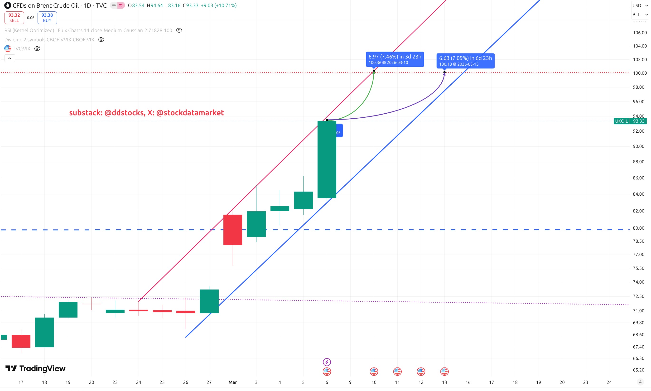 The daily chart is even more telling. The series of large green candles from March 2–6, each with minimal upper wicks, indicates that buyers are aggressively chasing every dip with almost no selling pressure at the highs. The price is tracking the steeper of the two projection lines, which points to $100 by roughly March 10 and potentially $107 by March 13. This isn’t a prediction — it’s a momentum trajectory that will hold until one of two things happens: a ceasefire announcement, or an exhaustion gap that signals a short-term top.