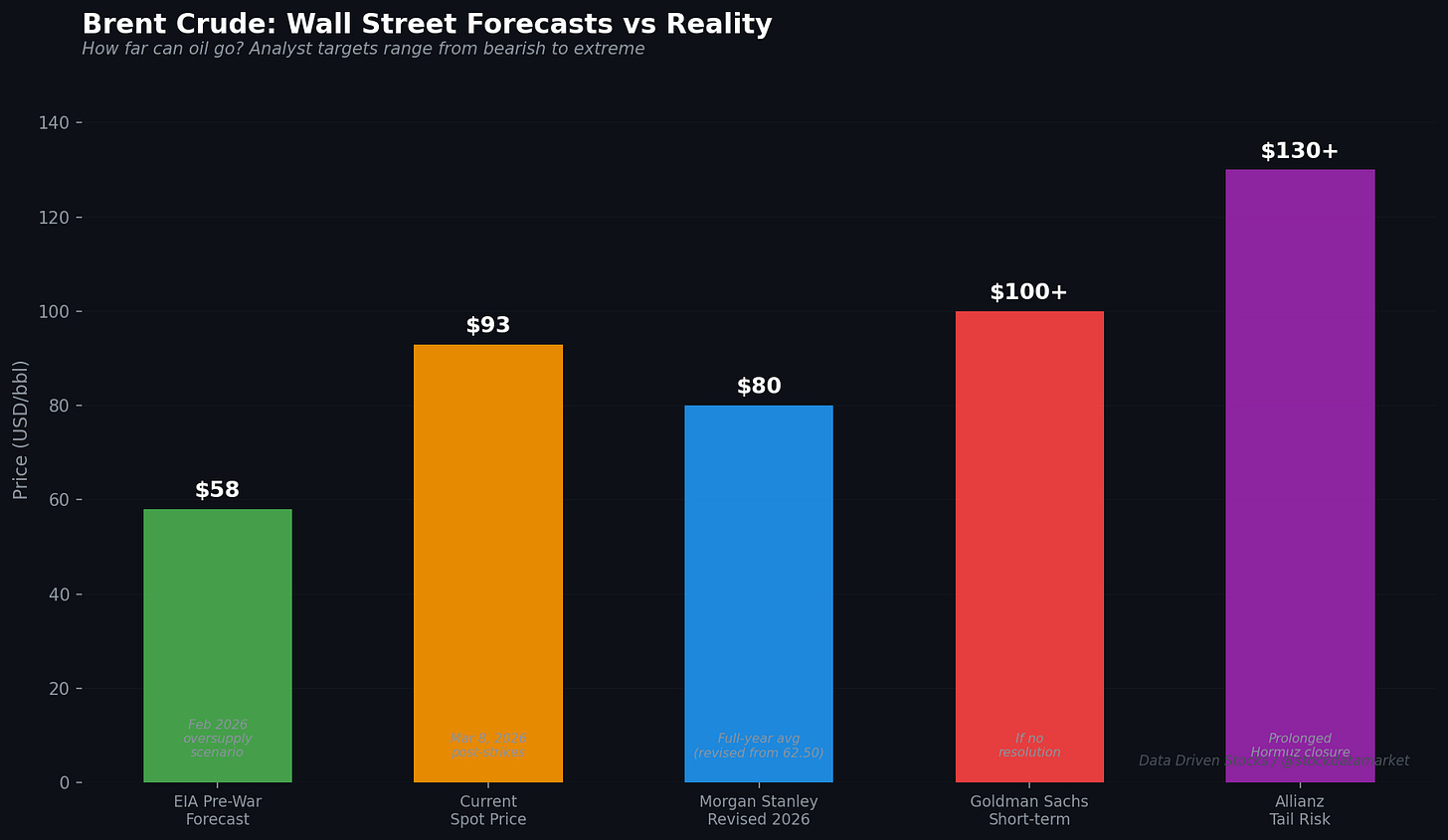 The EIA’s February 2026 Short-Term Energy Outlook called for a $58 annual average, based on a world where oversupply of 3.1 million bpd in inventory builds was the dominant story. That forecast is now effectively dead. Morgan Stanley moved fast, revising its full-year 2026 Brent forecast from $62.50 to $80/bbl — acknowledging that even a swift resolution would leave elevated risk premiums in place for months. Goldman’s warning of $100+ was the most aggressive near-term call, while Allianz and Barclays both modeled extreme tail scenarios of $120–$130 under a prolonged conflict.