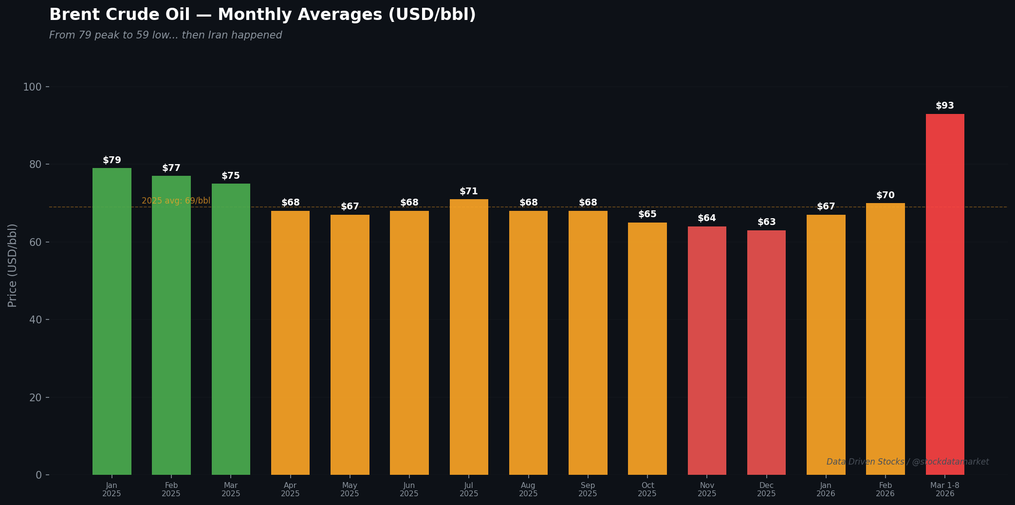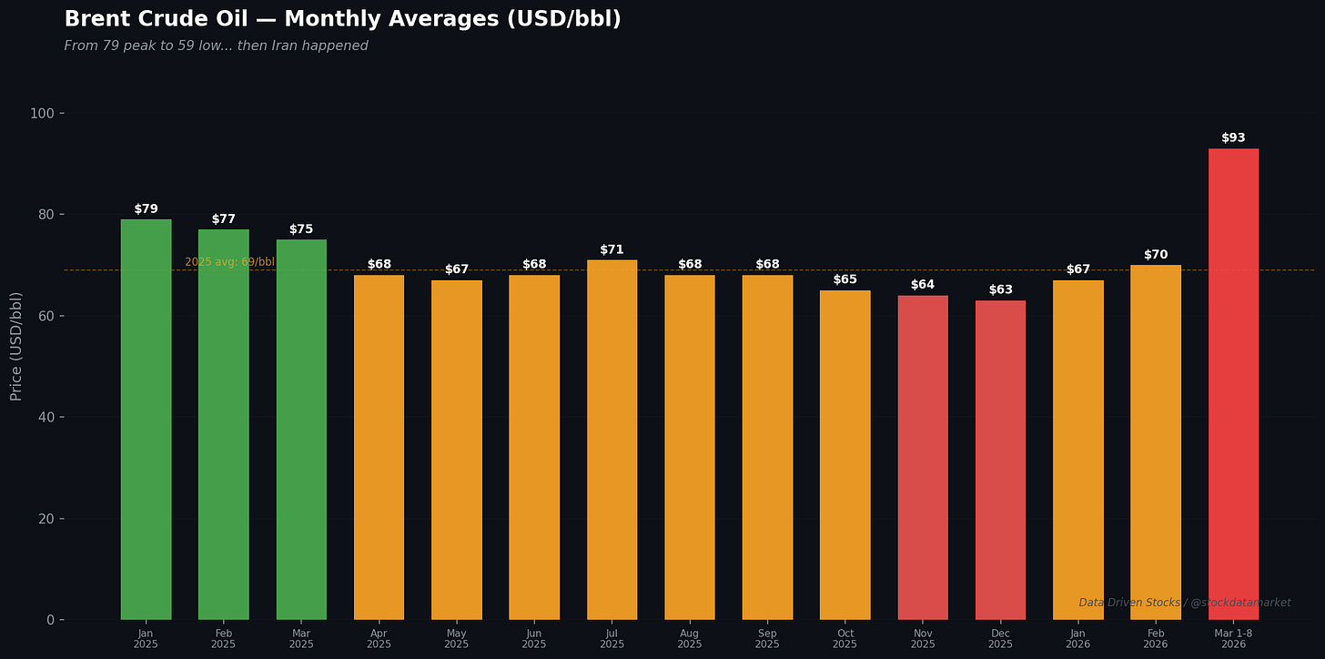 If you went to sleep (assuming that anyone sleeps in finance, because I don’t) on Friday, February 27th with Brent crude at $71.32 and woke up a week later, you’d think your Bloomberg terminal was broken. Brent closed March 6th at $92.69 — up nearly 30% in five trading sessions — and blew past $93 over the weekend. That’s the biggest weekly gain since the pandemic chaos of April 2020, and it happened for the most straightforward reason imaginable: war.