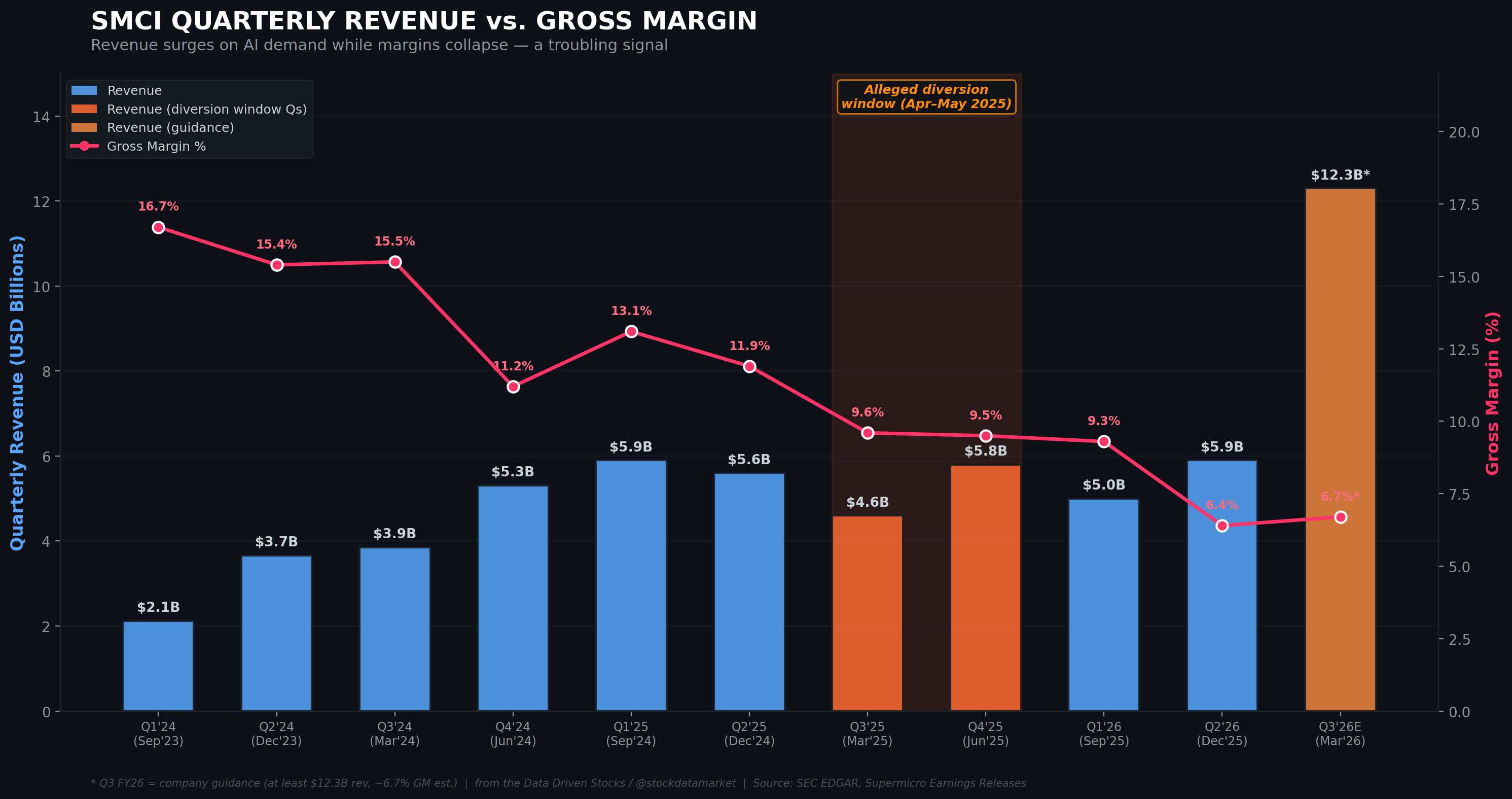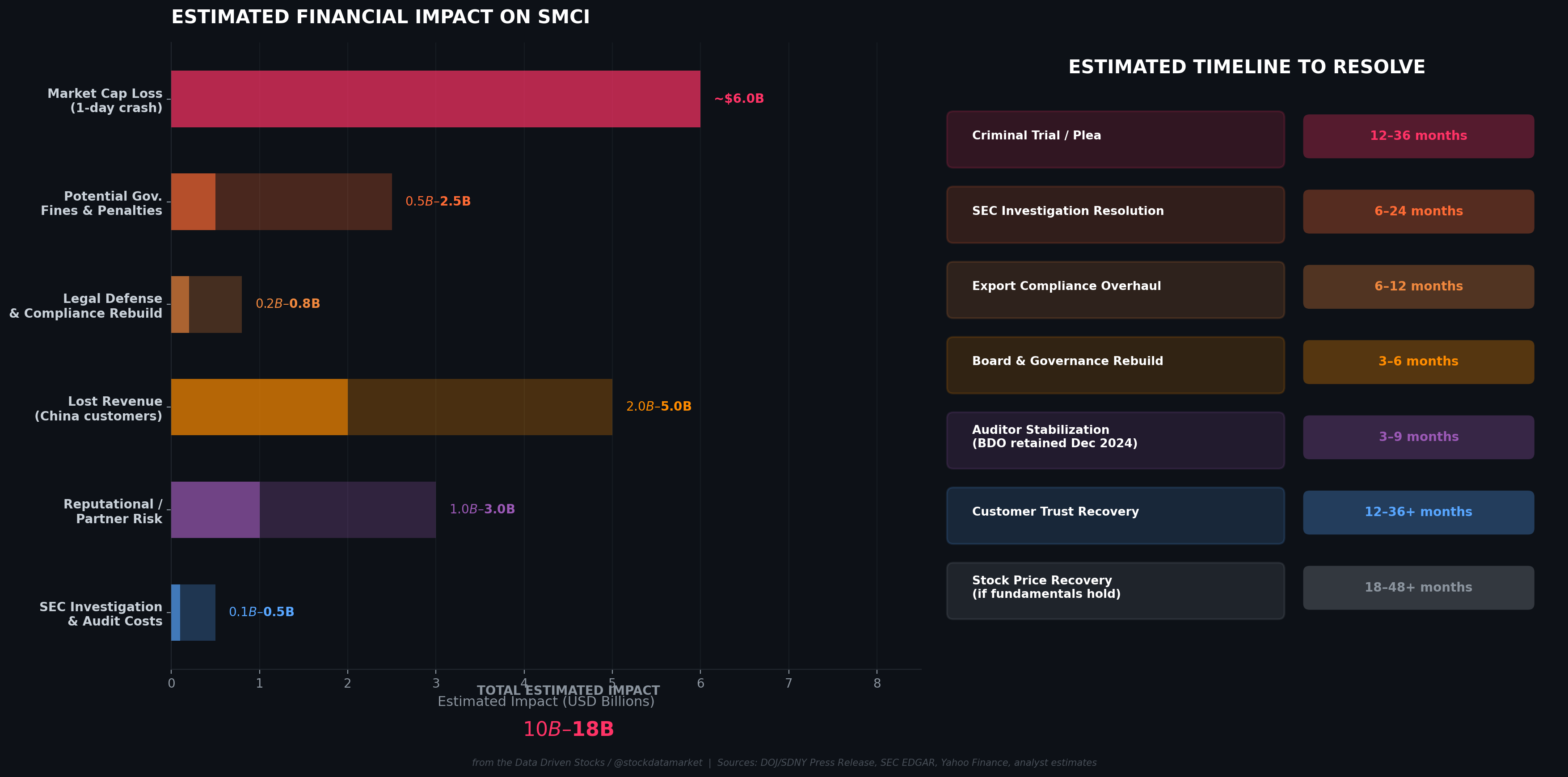 Note: All financial figures sourced from SEC EDGAR filings and official Supermicro earnings releases. Stock prices from Yahoo Finance. Legal case details from the DOJ/SDNY press release. Estimated financial impacts and timelines are based on analyst commentary, historical precedents in export control enforcement, and author estimates — not investment advice.