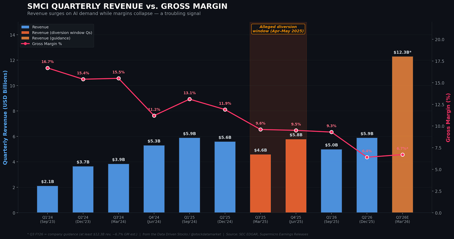 But the growth came at a cost — a literal one. Gross margins collapsed from roughly 17% in early fiscal 2024 to just 6.4% by the December 2025 quarter (Q2 FY26). The company was essentially buying market share at the expense of profitability, and the margin deterioration was stark enough to worry analysts even before the criminal charges dropped. For context, server peers like Dell Technologies typically run gross margins in the 20–22% range.