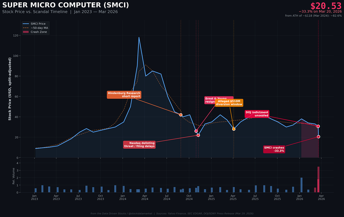 The immediate financial impact was brutal. SMCI’s stock dropped from $30.79 to $20.53 on March 20 — a 33.3% single-day decline that wiped roughly $6 billion off the company’s market capitalization. From its all-time high of approximately $118 per share in March 2024, the stock has now lost about 82.6% of its value. As of March 21, 2026, the market cap sits around $12 billion, down from over $70 billion at the peak.