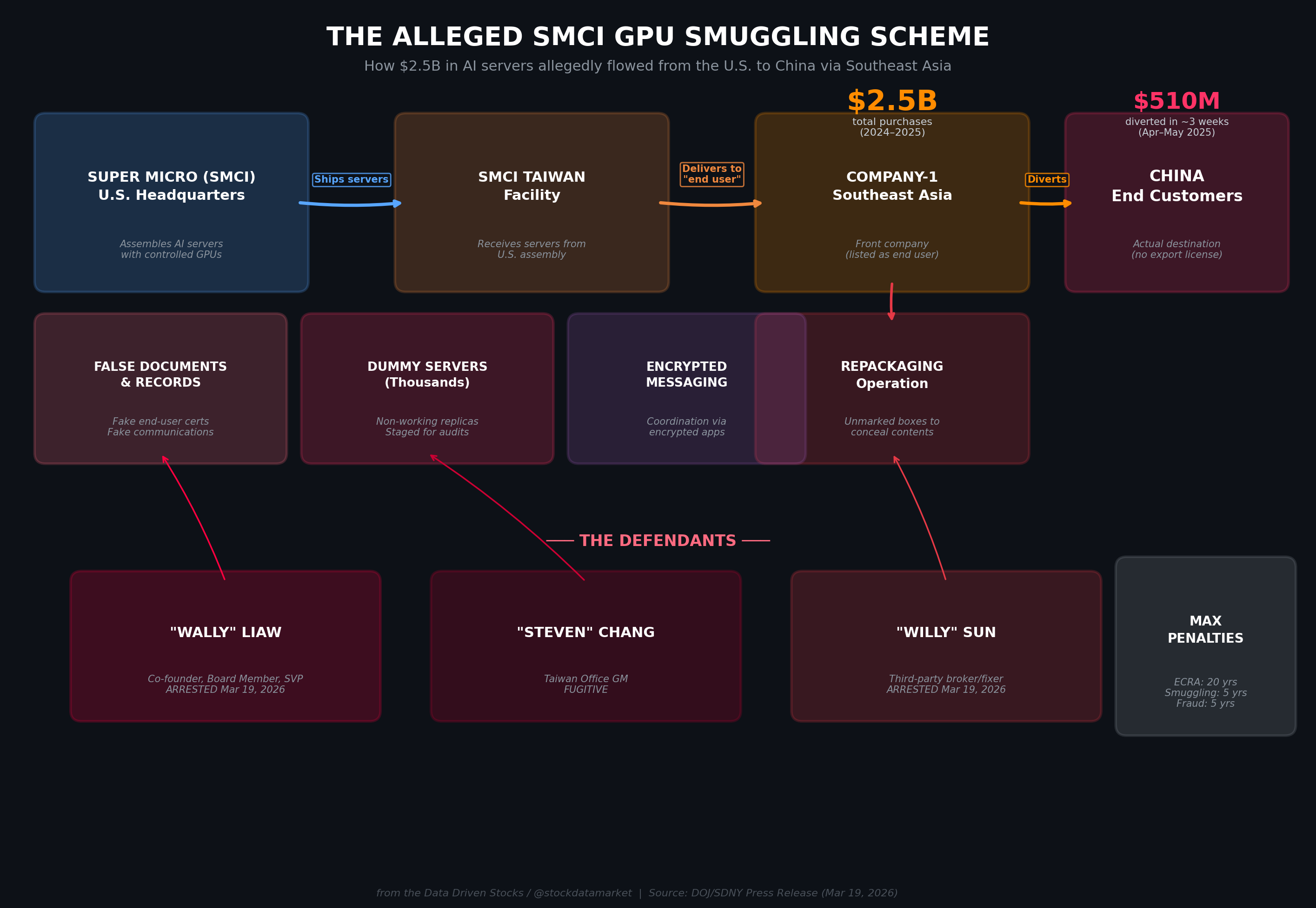 On March 19, 2026, the U.S. Attorney’s Office for the Southern District of New York dropped a bombshell. Three individuals connected to Super Micro Computer, Inc. (Nasdaq: SMCI) were charged with conspiring to illegally divert U.S.-assembled AI servers — packed with export-controlled GPUs — to end customers in China, without the required Commerce Department licenses. One of the three was a co-founder and board member of the company. The stock cratered 33% the next day.