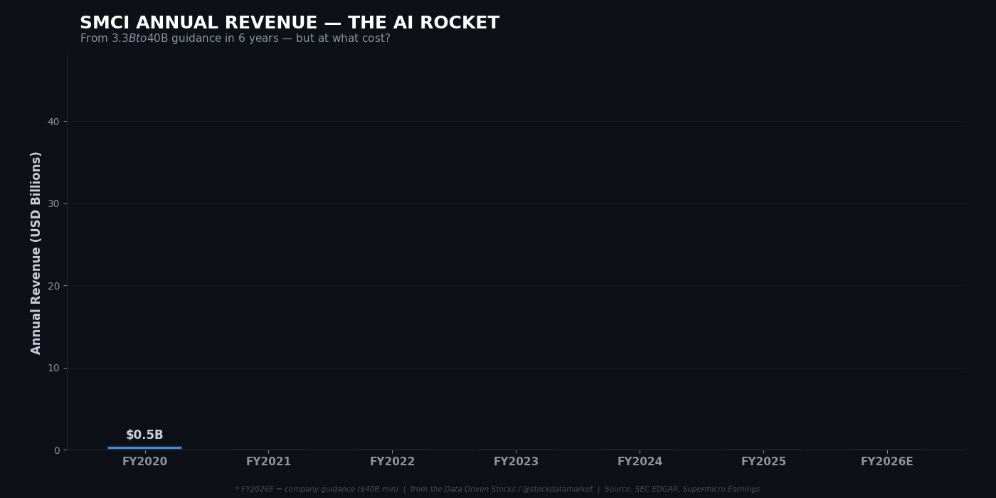 To understand why this case matters so much for investors, you have to look at what SMCI had become by 2024 and 2025. This was a company riding the AI infrastructure wave harder than almost anyone. Revenue went from around $3.3 billion in fiscal year 2020 to a projected $40 billion in fiscal year 2026. That’s a twelve-fold increase in six years, driven almost entirely by surging demand for data center servers packed with Nvidia GPUs for AI workloads.