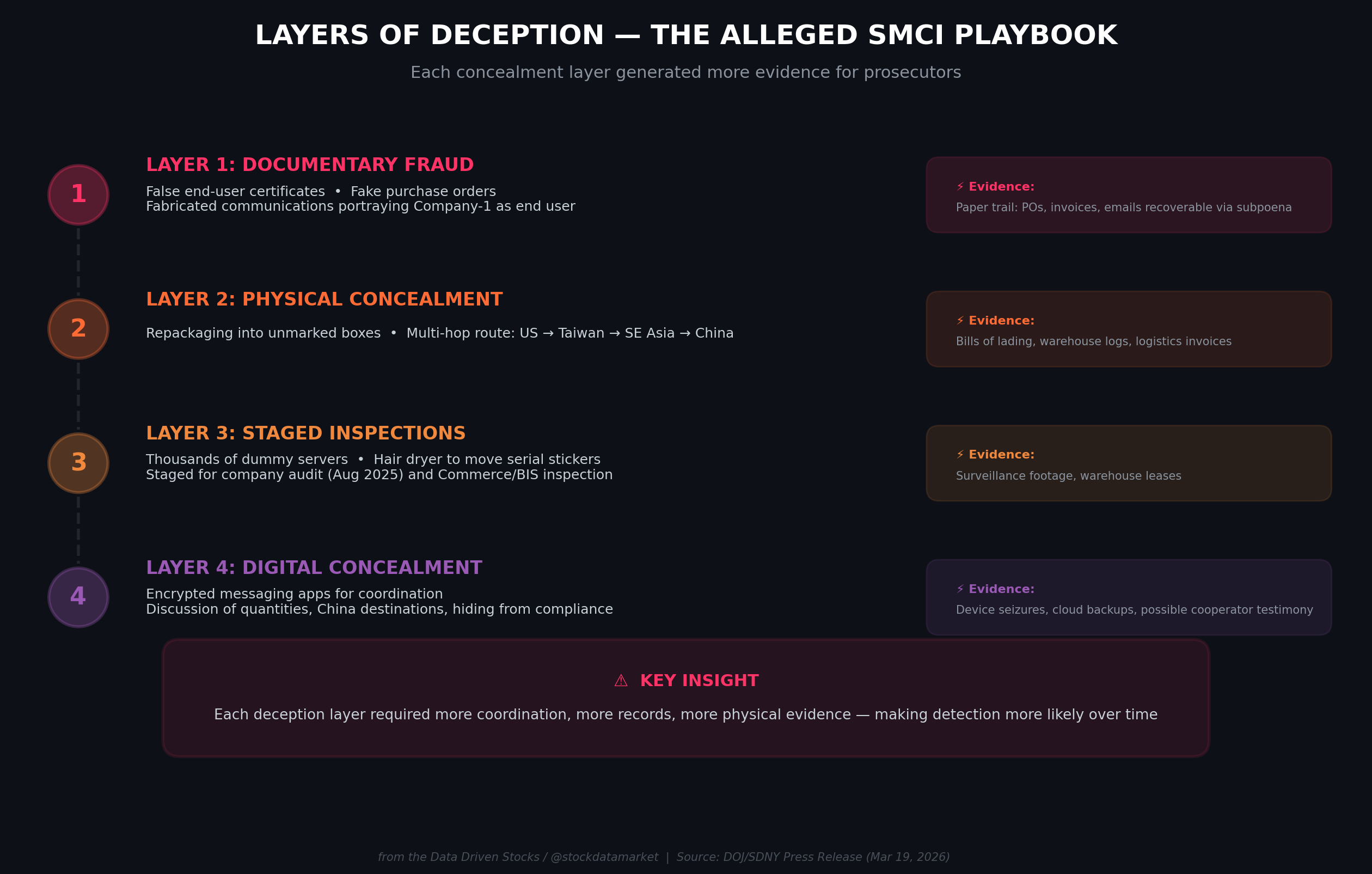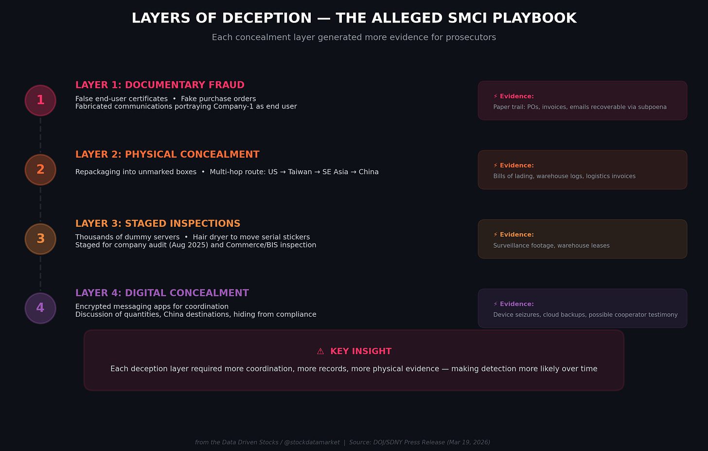The alleged scheme was sophisticated — involving four distinct layers of deception across multiple countries, using both physical and digital concealment techniques. But sophistication cuts both ways. Every layer created more evidence, more witnesses, more records. The hair dryer that moved serial number stickers was captured on camera. The encrypted chat messages discussed China destinations by name. The dummy servers needed warehouse space, procurement budgets, and logistics coordination — all of which leave traces.