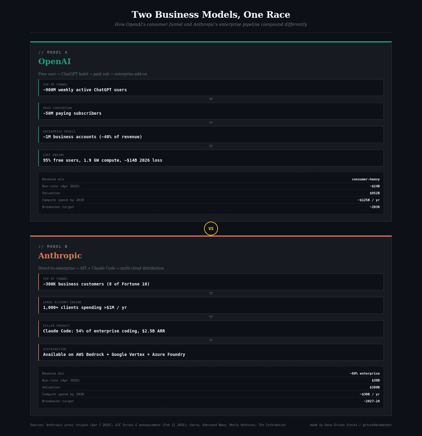 The crossover does not mean Anthropic has won the long game. OpenAI still has 900 million weekly users, the most recognized brand in artificial intelligence, and a balance sheet that can absorb years of $14 billion losses. But the crossover does mean that the simplest narrative of the AI race - that scale of users equals scale of revenue equals scale of victory - is now empirically wrong. Enterprise pipelines compound. Consumer funnels leak. And when the next AI IPO bell rings, the company on the podium may not be the one anyone expected eighteen months ago.