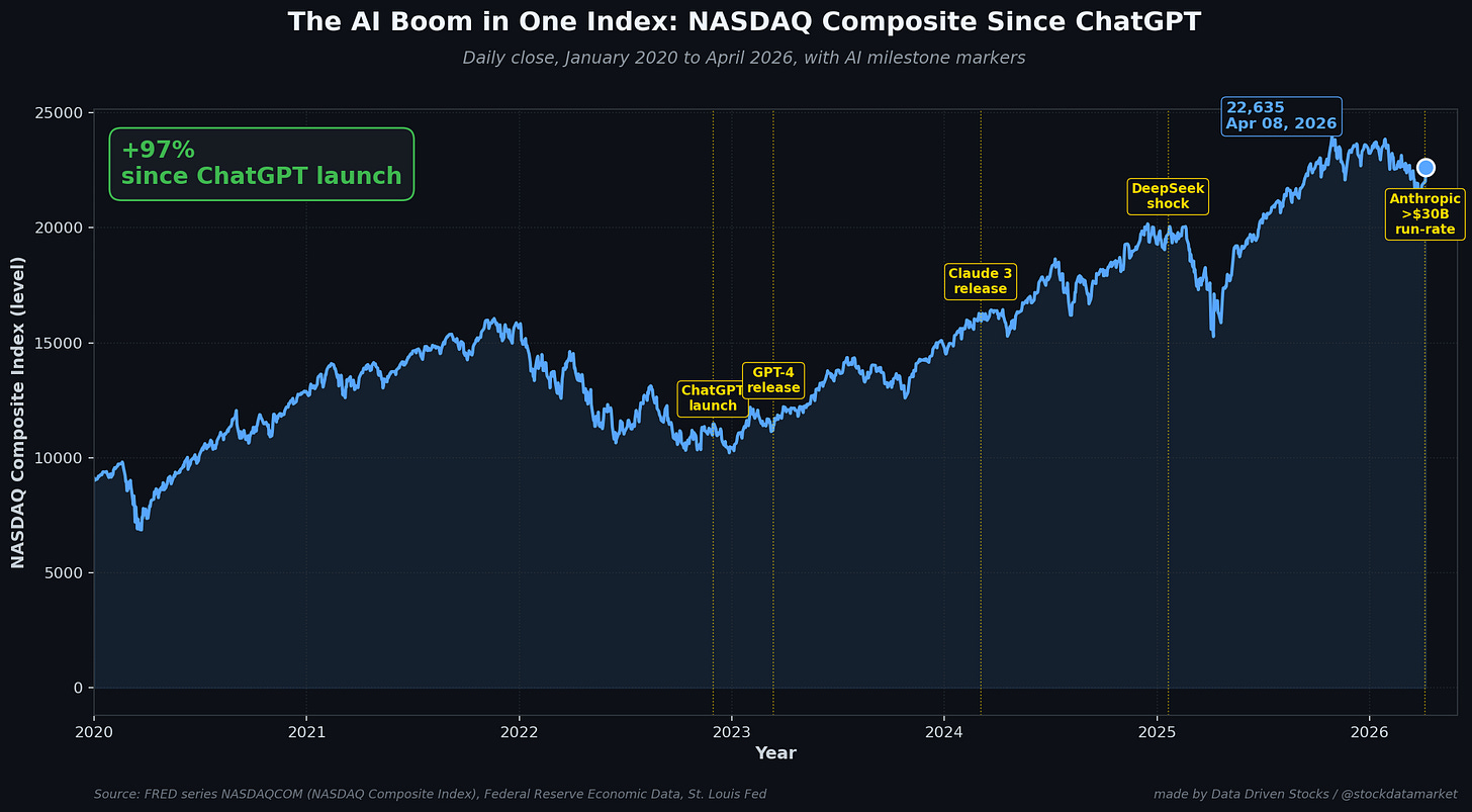 Zoom out and the OpenAI-Anthropic race is no longer a private-company curiosity. It is now one of the two or three largest single drivers of global capital expenditure. The combined compute commitments of the frontier labs, the hyperscalers building data centers to host them, and the chipmakers selling the silicon together represent the largest infrastructure buildout in modern technology history. NVIDIA’s market cap is not what it is because of gaming. Broadcom’s accelerated chip business is not what it is because of networking. The entire data-center REIT and power-generation complex is being repriced around AI demand that originates, ultimately, in the budgets of the companies in this article.