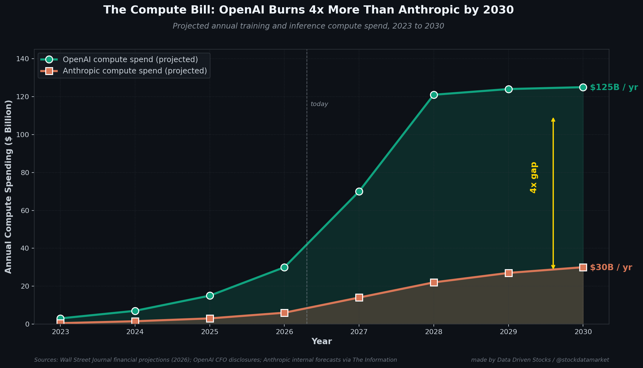 If revenue is the offense in this game, compute is the defense, and the defensive postures of the two companies could not be more different. According to projections leaked to the Wall Street Journal and corroborated by The Information, OpenAI is on track to spend roughly $121 billion on compute in 2028 alone, climbing to about $125 billion per year by 2030. Anthropic’s projection for the same period is roughly $30 billion. Same race, four-times difference in burn rate.