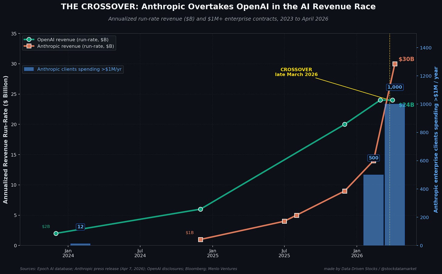OpenAI’s growth has been extraordinary by any normal benchmark - it went from roughly $2 billion in 2023 to $6 billion in 2024 to $20 billion by the end of 2025 - but its trajectory has compounded at “only” about 3.4x per year. By the end of March 2026 OpenAI had reached roughly $24 billion in annualized run-rate, or about $2 billion per month. When you stack a 10x curve against a 3.4x curve and let them run for long enough, the math is going to win, and the math just won.