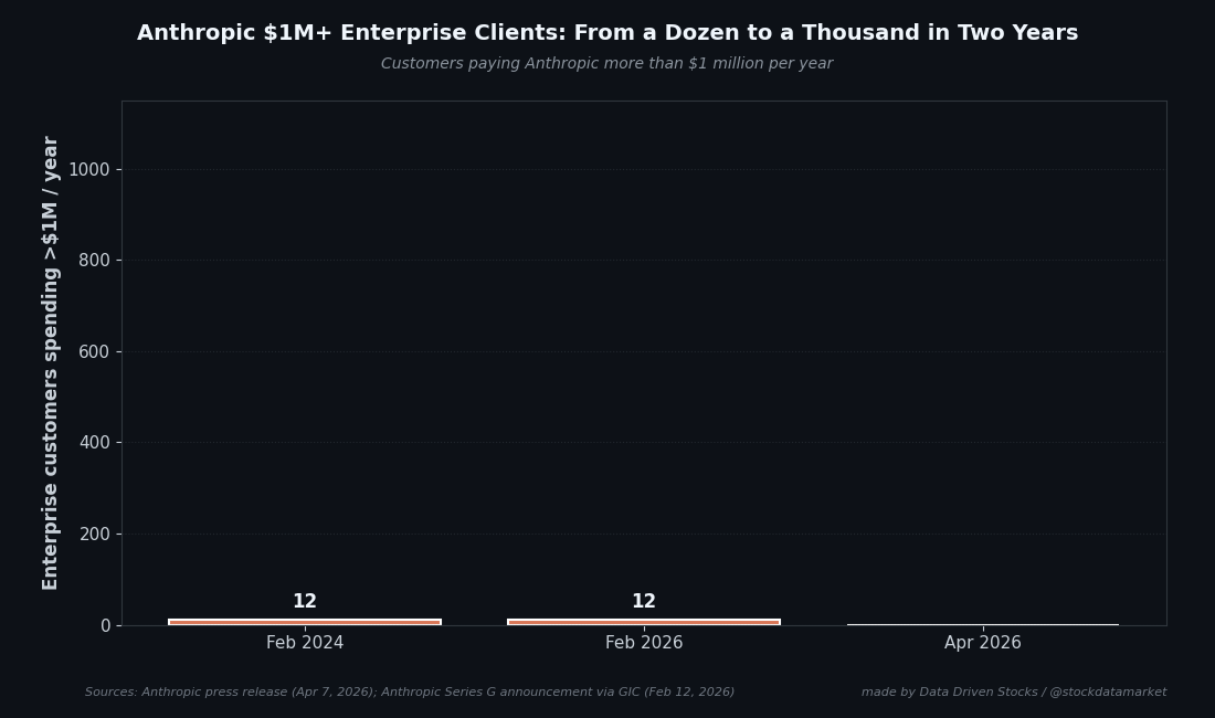 Headline revenue is the part everyone screenshots. The number that actually explains the gap is buried one line down in Anthropic’s announcement: more than 1,000 enterprise customers now pay Anthropic over $1 million per year. That number was twelve two years earlier - Anthropic’s own framing in its February 2026 Series G announcement was that “two years ago, a dozen customers spent over $1 million annually with Anthropic, and today that number exceeds 500.” Eight weeks after the Series G round closed, that 500 had doubled again to over 1,000.