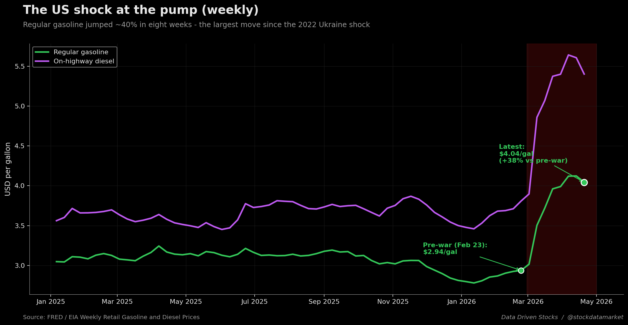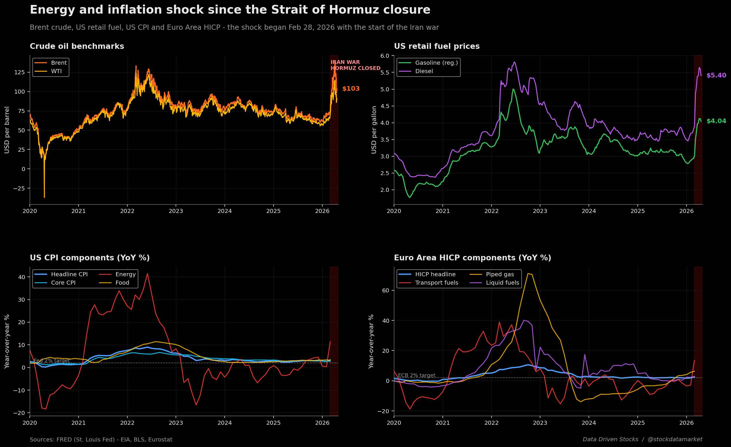 Charts and analysis by Data Driven Stocks / @stockdatamarket. Data: FRED, EIA, BLS, Eurostat. Last updated: April 27, 2026.